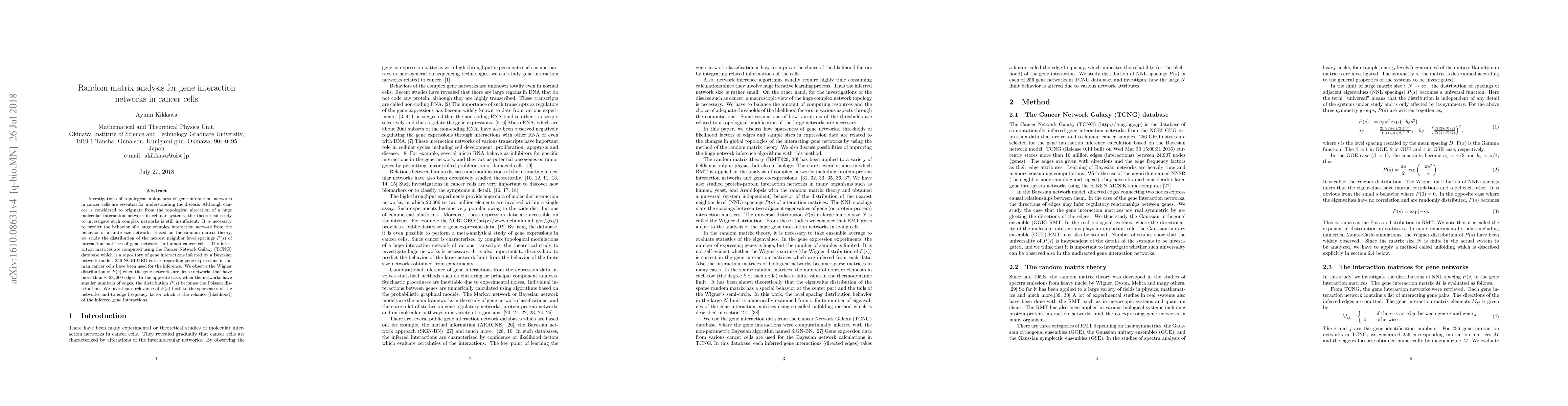 Investigations of topological uniqueness of gene interaction networks in cancer cells are essential for understanding this disease. Based on the random matrix theory, we study the distribution of the nearest neighbor level spacings $P(s)$ of interaction matrices for gene networks in human cancer cells. The interaction matrices are computed using the Cancer Network Galaxy (TCNG) database, which is a repository of gene interactions inferred by a Bayesian network model. 256 NCBI GEO entries regarding gene expressions in human cancer cells have been selected for the Bayesian network calculations in TCNG. We observe the Wigner distribution of $P(s)$ when the gene networks are dense networks that have more than $\sim 38,000$ edges. In the opposite case, when the networks have smaller numbers of edges, the distribution $P(s)$ becomes the Poisson distribution. We investigate relevance of $P(s)$ both to the size of the networks and to edge frequencies that manifest reliance of the inferred gene interactions.
