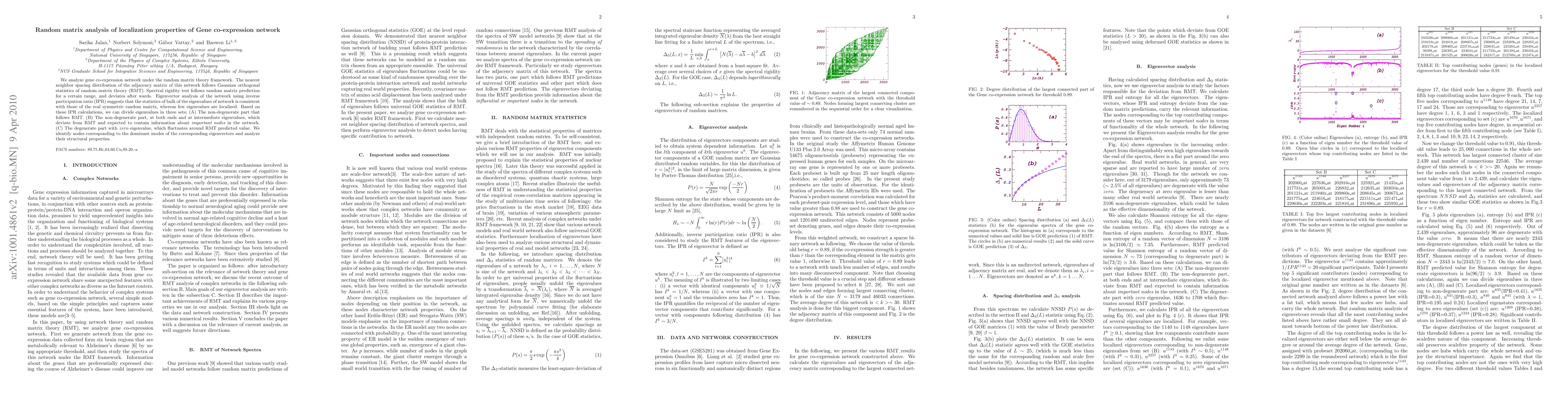 This paper uses random matrix theory to analyze gene co-expression networks, finding that most eigenvalues follow Gaussian orthogonal statistics but a few are localized. It identifies important nodes based on deviations from random matrix predictions.