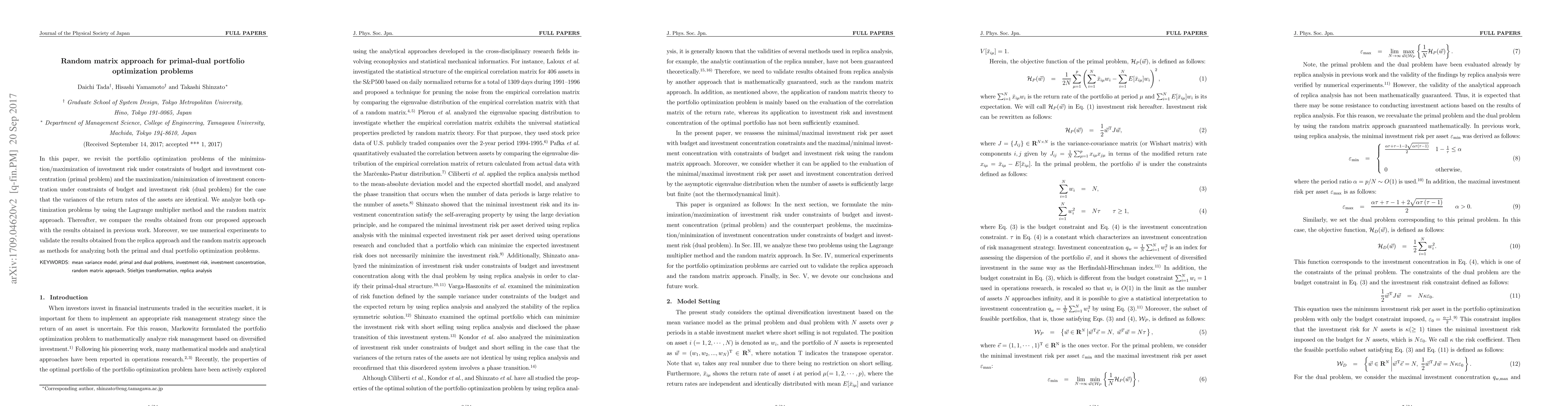 In this paper, we revisit the portfolio optimization problems of the minimization/maximization of investment risk under constraints of budget and investment concentration (primal problem) and the maximization/minimization of investment concentration under constraints of budget and investment risk (dual problem) for the case that the variances of the return rates of the assets are identical. We analyze both optimization problems by using the Lagrange multiplier method and the random matrix approach. Thereafter, we compare the results obtained from our proposed approach with the results obtained in previous work. Moreover, we use numerical experiments to validate the results obtained from the replica approach and the random matrix approach as methods for analyzing both the primal and dual portfolio optimization problems.