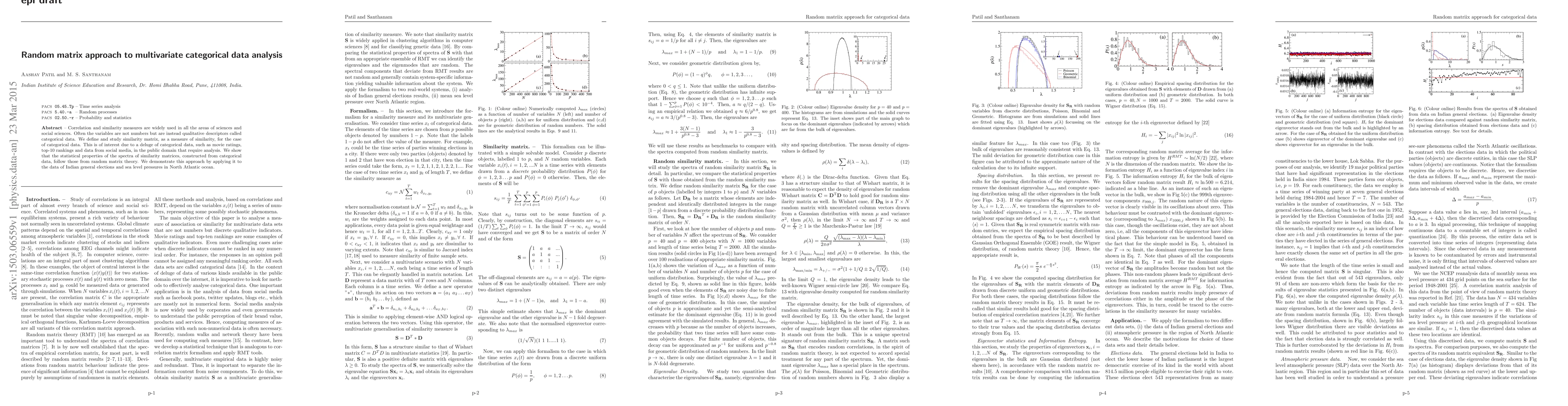 This paper introduces a random matrix approach to analyzing multivariate categorical data, demonstrating that the statistical properties of similarity matrices derived from such data align with those from random matrix theory. The method is exemplified through applications to Indian general election data and sea level pressures in the North Atlantic Ocean.