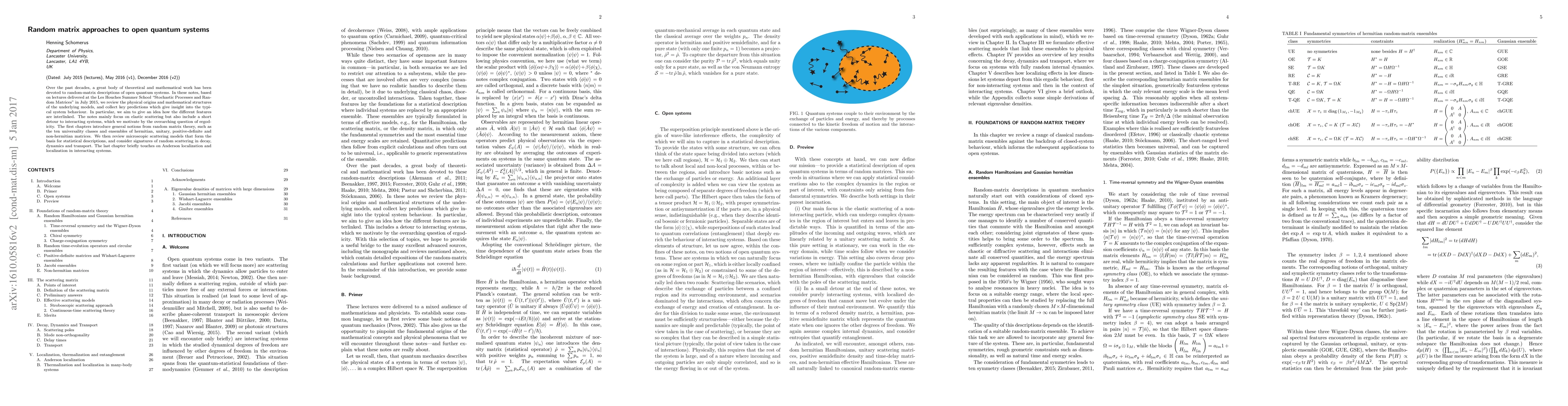The paper reviews random matrix approaches to open quantum systems, focusing on elastic scattering and briefly touching on interacting systems. It introduces concepts from random matrix theory, including universality classes and ensembles of hermitian, unitary, positive-definite, and non-hermitian matrices. The study examines microscopic scattering models and their statistical descriptions, as well as signatures of random scattering in decay, dynamics, and transport.