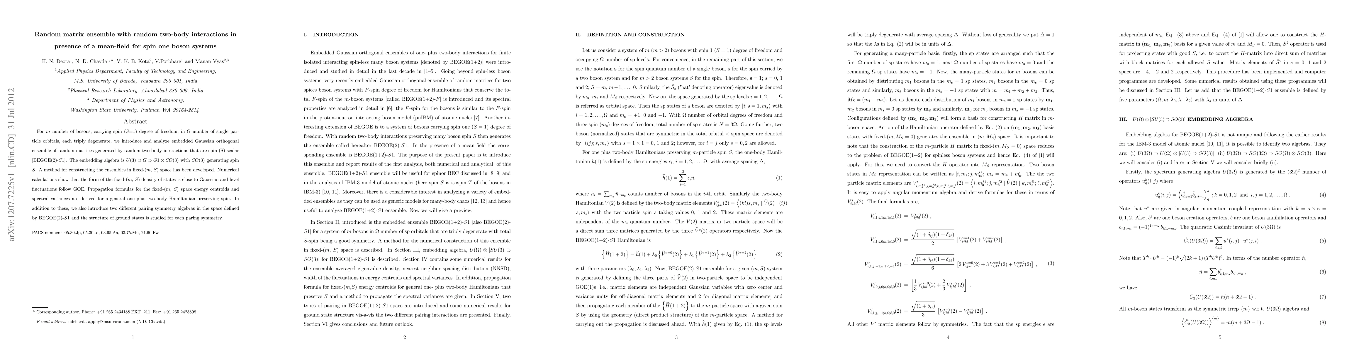 This paper introduces a Gaussian orthogonal ensemble of random matrices for spin one boson systems with random two-body interactions, analyzing the density of states and level fluctuations. It also develops propagation formulas for energy centroids and spectral variances, and explores ground state structures under different pairing symmetries.