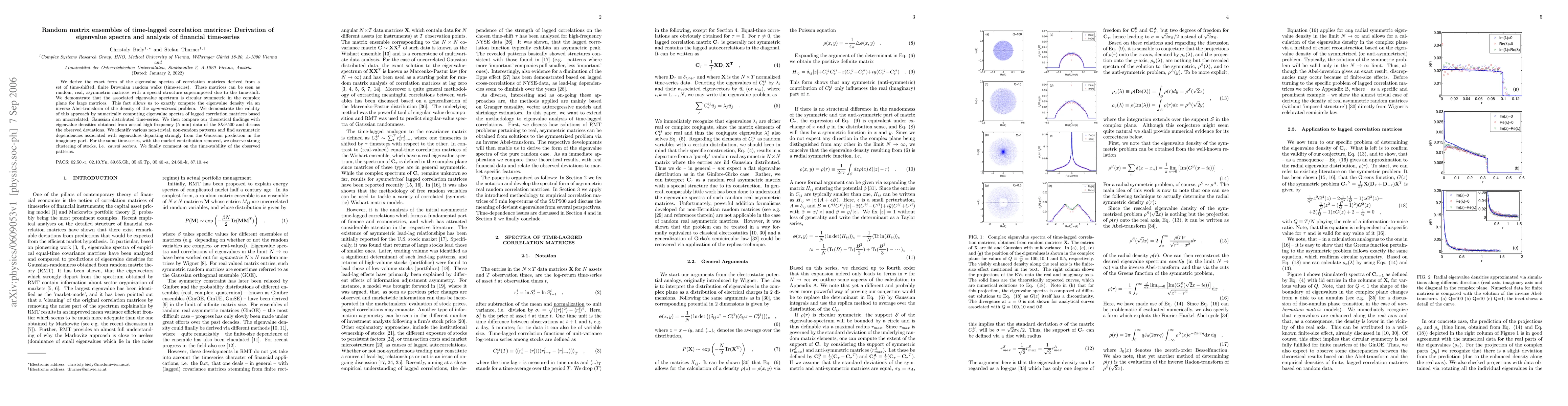 This paper derives the exact eigenvalue spectra of time-lagged correlation matrices from Brownian random walks, showing circular symmetry in the complex plane for large matrices. The study applies this to financial time-series data from the S&P500, revealing non-random patterns and asymmetric dependencies in the eigenvalue density, and discusses the time-stability of these patterns.