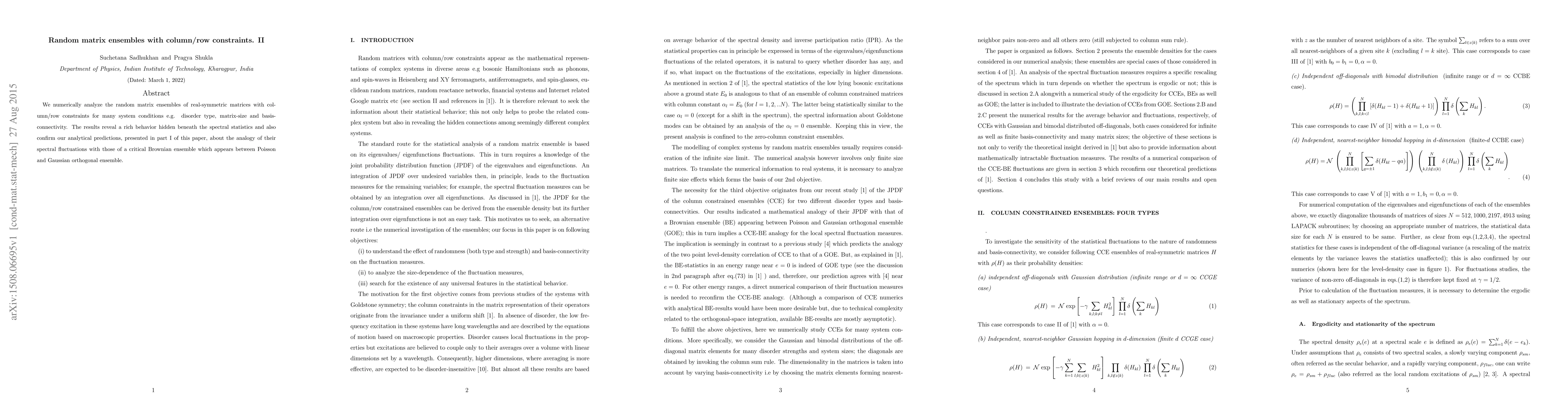 We numerically analyze the random matrix ensembles of real-symmetric matrices with column/row constraints for many system conditions e.g. disorder type, matrix-size and basis-connectivity. The results reveal a rich behavior hidden beneath the spectral statistics and also confirm our analytical predictions, presented in part I of this paper, about the analogy of their spectral fluctuations with those of a critical Brownian ensemble which appears between Poisson and Gaussian orthogonal ensemble.
