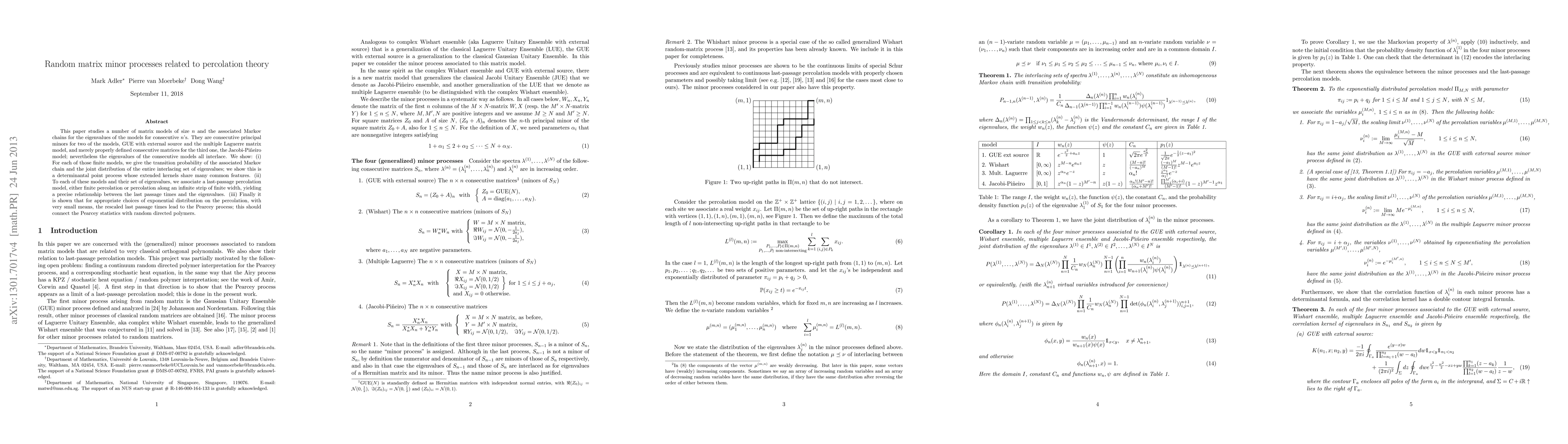 This paper explores the connection between random matrix models and percolation theory, showing that eigenvalues from different models interlace and establishing a relationship between last passage times and eigenvalues.
