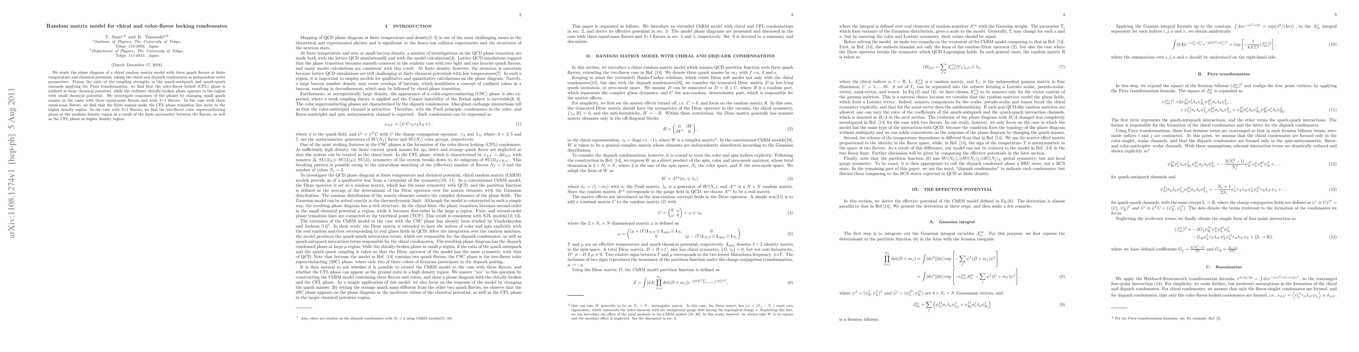 This paper explores the phase diagram of a chiral random matrix model with three quark flavors at finite temperature and chemical potential, identifying the color-flavor locked (CFL) phase at high chemical potential and a chirally-broken phase at low chemical potential. It also investigates the effects of quark masses on these phases, finding shifts in the CFL transition line and the emergence of a two-flavor color superconducting phase due to flavor asymmetry.
