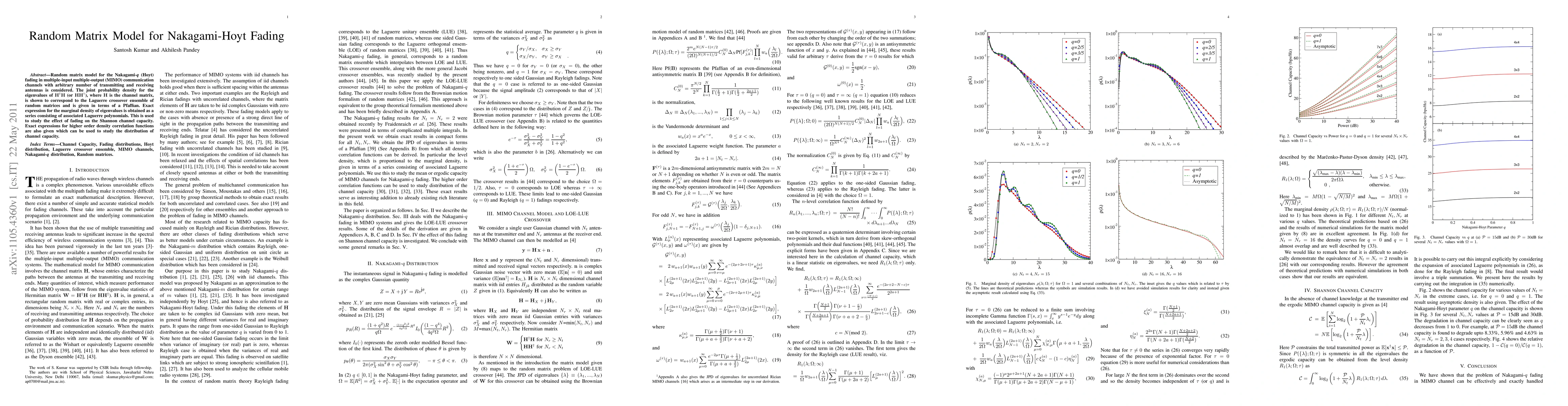 This paper explores the random matrix model for Nakagami-Hoyt fading in MIMO channels, showing that the joint probability density of eigenvalues corresponds to the Laguerre ensemble and is expressed via a Pfaffian. It derives exact expressions for the marginal density and higher-order correlation functions to analyze the impact on Shannon channel capacity.