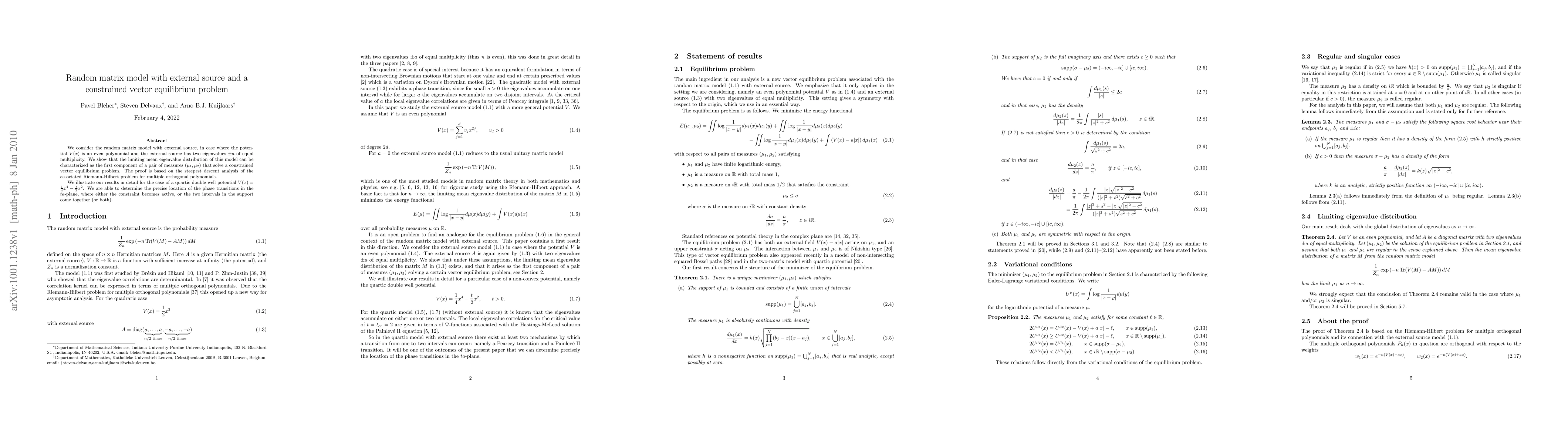 We consider the random matrix model with external source, in case where the potential V(x) is an even polynomial and the external source has two eigenvalues a, -a of equal multiplicity. We show that the limiting mean eigenvalue distribution of this model can be characterized as the first component of a pair of measures (mu_1,mu_2) that solve a constrained vector equilibrium problem. The proof is based on the steepest descent analysis of the associated Riemann-Hilbert problem for multiple orthogonal polynomials. We illustrate our results in detail for the case of a quartic double well potential V(x) = x^4/4 - tx^2/2. We are able to determine the precise location of the phase transitions in the ta-plane, where either the constraint becomes active, or the two intervals in the support come together (or both).