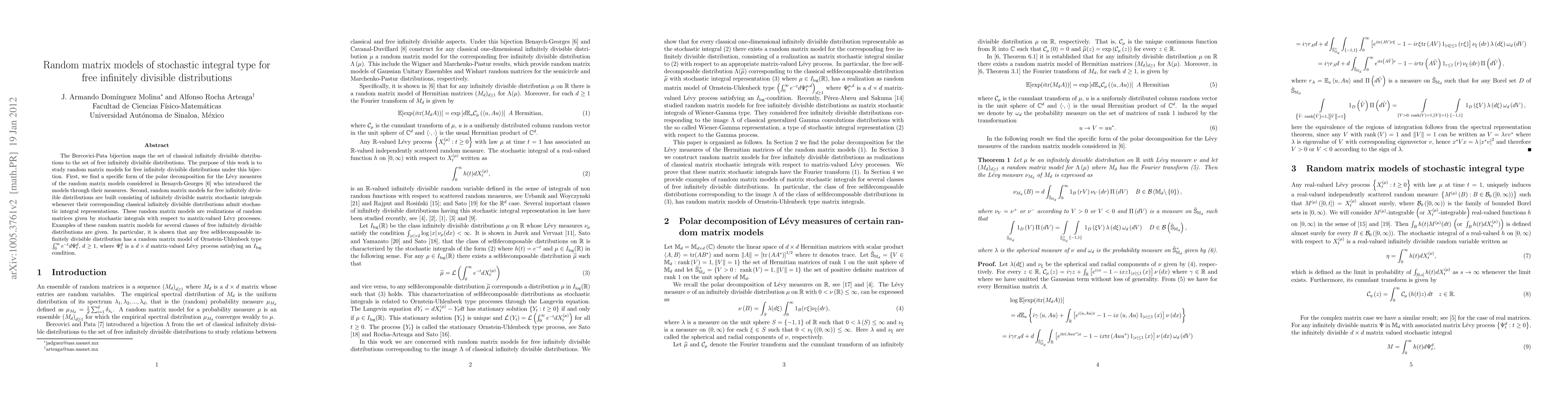 This paper explores random matrix models for free infinitely divisible distributions via the Bercovici-Pata bijection, deriving a specific polar decomposition form for their Lévy measures and constructing matrix stochastic integral models. It demonstrates that free selfdecomposable distributions correspond to Ornstein-Uhlenbeck type random matrix models driven by matrix-valued Lévy processes.
