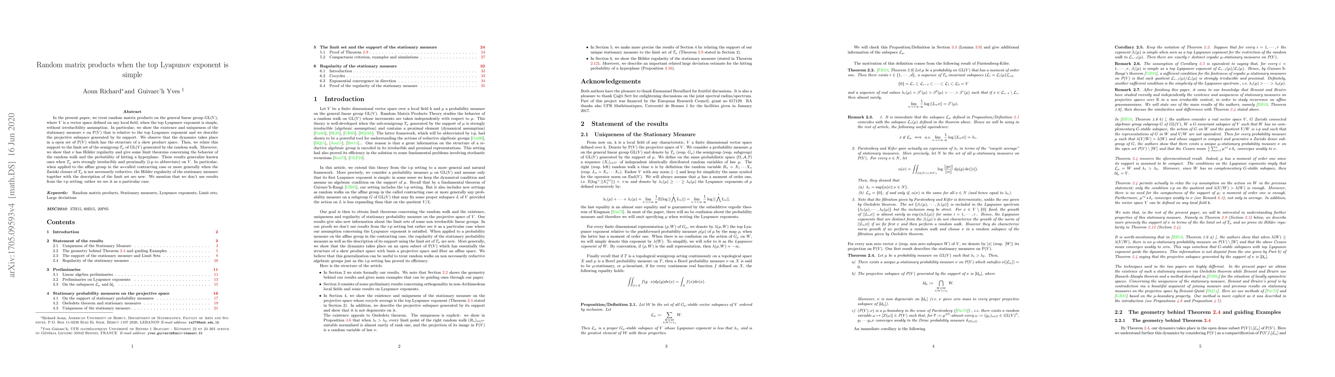 In the present paper, we treat random matrix products on the general linear group $\textrm{GL}(V)$, where $V$ is a vector space defined on any local field, when the top Lyapunov exponent is simple, without irreducibility assumption. In particular, we show the existence and uniqueness of the stationary measure $\nu$ on $\textrm{P}(V)$ that is relative to the top Lyapunov exponent and we describe the projective subspace generated by its support. We observe that the dynamics takes place in a open set of $\textrm{P}(V)$ which has the structure of a skew product space. Then, we relate this support to the limit set of the semi-group $T_{\mu}$ of $\textrm{GL}(V)$ generated by the random walk. Moreover, we show that $\nu$ has H\"older regularity and give some limit theorems concerning the behavior of the random walk and the probability of hitting a hyperplane. These results generalize known ones when $T_{\mu}$ acts strongly irreducibly and proximally (i-p to abbreviate) on $V$. In particular, when applied to the affine group in the so-called contracting case or more generally when the Zariski closure of $T_{\mu}$ is not necessarily reductive, the H\"older regularity of the stationary measure together with the description of the limit set are new. We mention that we don't use results from the i-p setting; rather we see it as a particular case.
