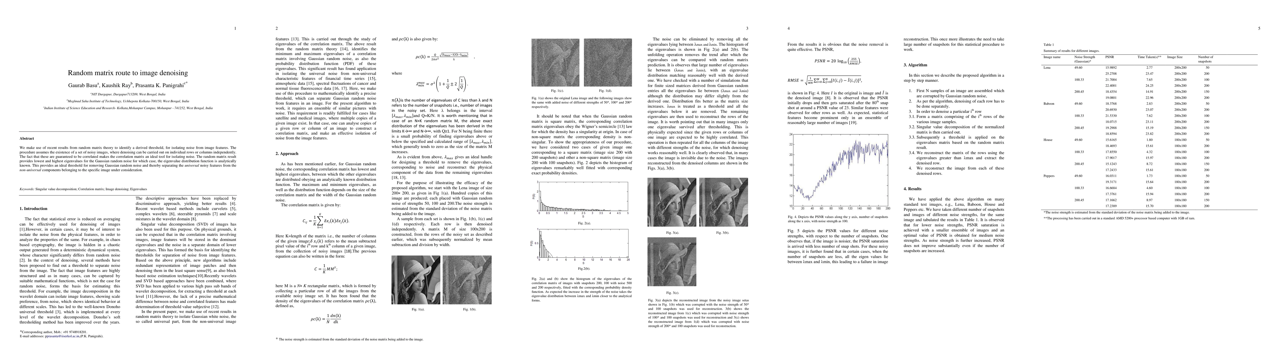 We make use of recent results from random matrix theory to identify a derived threshold, for isolating noise from image features. The procedure assumes the existence of a set of noisy images, where denoising can be carried out on individual rows or columns independently. The fact that these are guaranteed to be correlated makes the correlation matrix an ideal tool for isolating noise. The random matrix result provides lowest and highest eigenvalues for the Gaussian random noise for which case, the eigenvalue distribution function is analytically known. This provides an ideal threshold for removing Gaussian random noise and thereby separating the universal noisy features from the non-universal components belonging to the specific image under consideration.