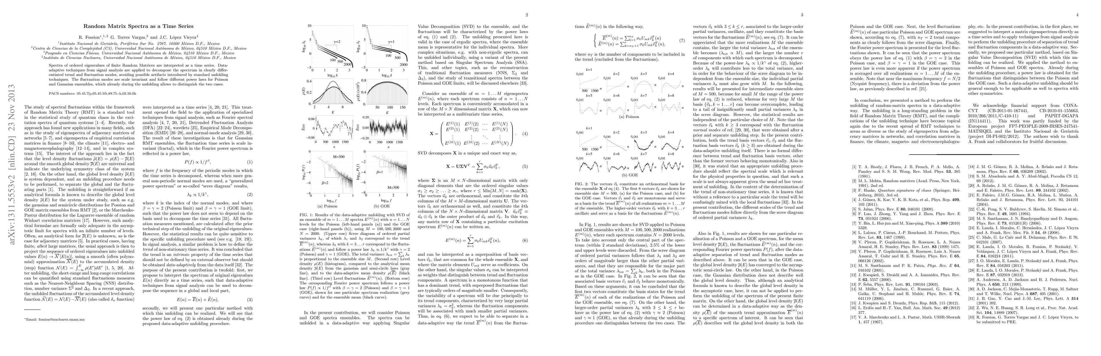 This paper interprets the spectra of random matrices as time series, employing data-adaptive signal analysis techniques to distinguish between trend and fluctuation modes. It reveals scale invariant fluctuation modes following different power laws for Poisson and Gaussian ensembles, aiding in distinguishing between these ensembles.