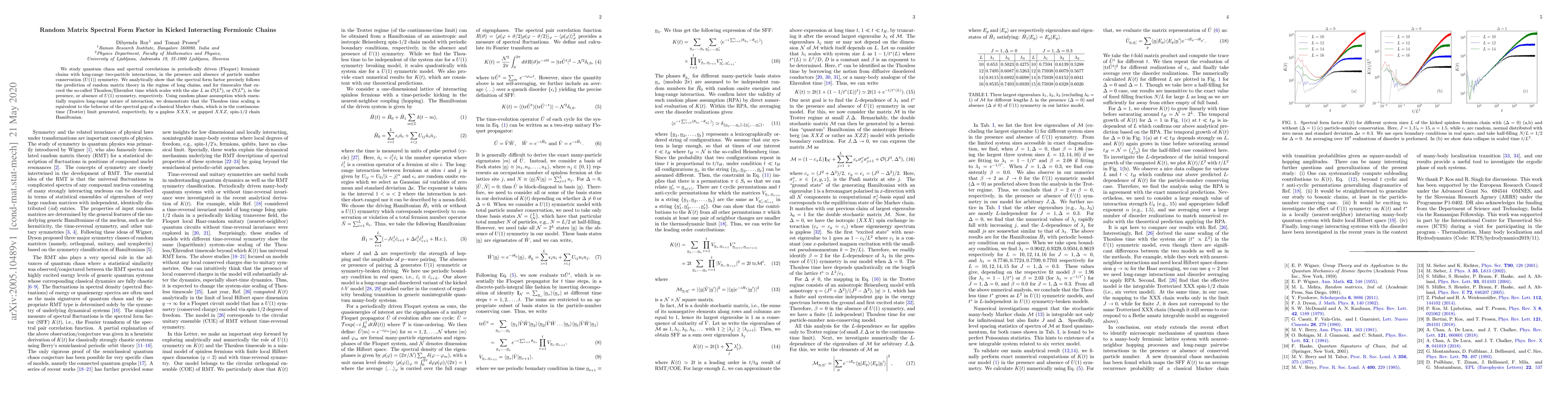 This paper investigates quantum chaos in periodically driven fermionic chains with long-range interactions, showing that the spectral form factor aligns with random matrix theory predictions. It finds that the Thouless time scaling depends on the presence or absence of $U(1)$ symmetry, correlating with the spectral gap behavior of classical Markov chains.