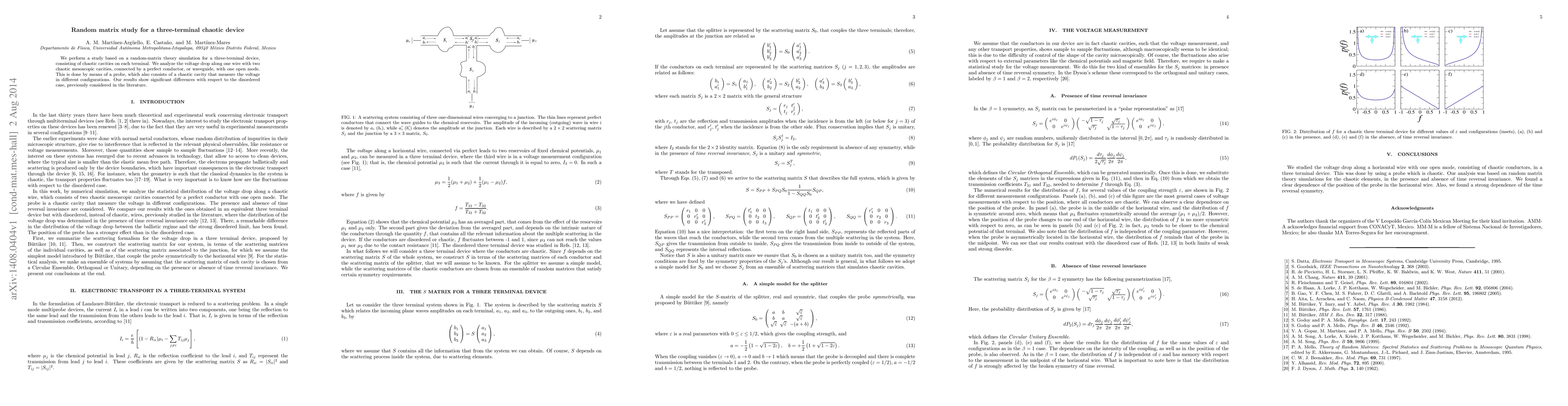 This study employs random matrix theory to simulate a three-terminal chaotic device with mesoscopic cavities, revealing significant differences in voltage drop compared to disordered systems, challenging previous literature findings.