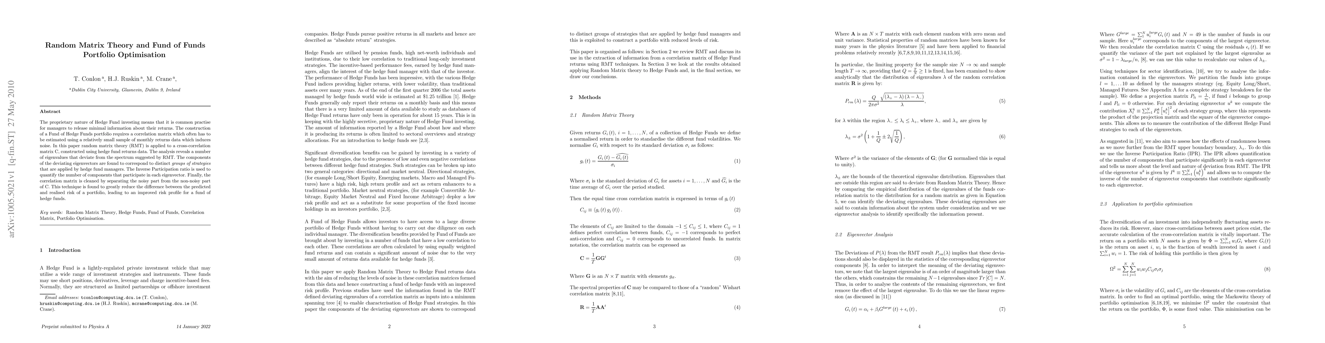 This paper applies random matrix theory to optimize Fund of Hedge Funds portfolios by analyzing the correlation matrix of hedge fund returns, identifying distinct strategy groups, and reducing noise to improve the risk profile. The technique enhances the accuracy of predicted versus realized risk.