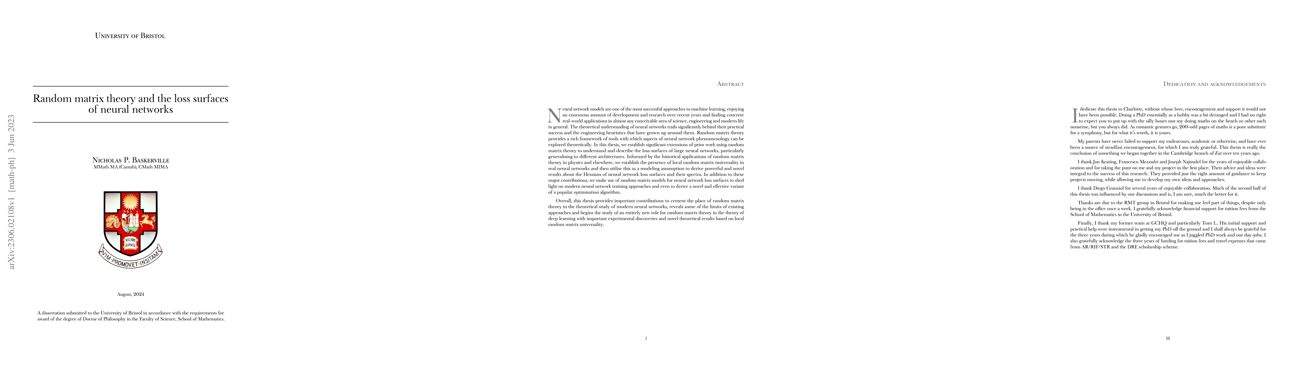 This paper applies random matrix theory to explore the loss surfaces of large neural networks, establishing local random matrix universality and deriving insights into the Hessians and spectra of neural network loss functions. It also introduces a novel optimization algorithm variant based on these findings.