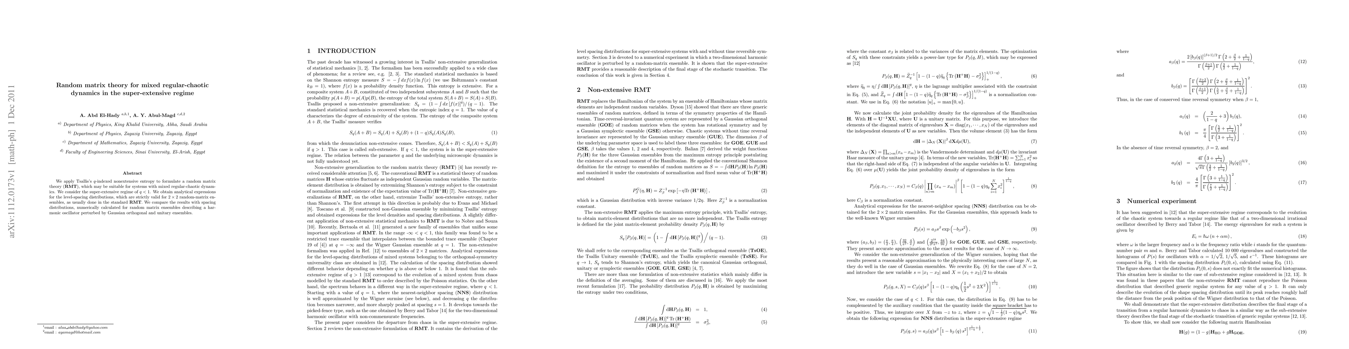 This paper develops a random matrix theory (RMT) using Tsallis's nonextensive entropy for systems with mixed regular-chaotic dynamics, focusing on the super-extensive regime where q < 1. Analytical expressions for level-spacing distributions are derived for 2 × 2 random-matrix ensembles and compared with numerical results from harmonic oscillator perturbations.