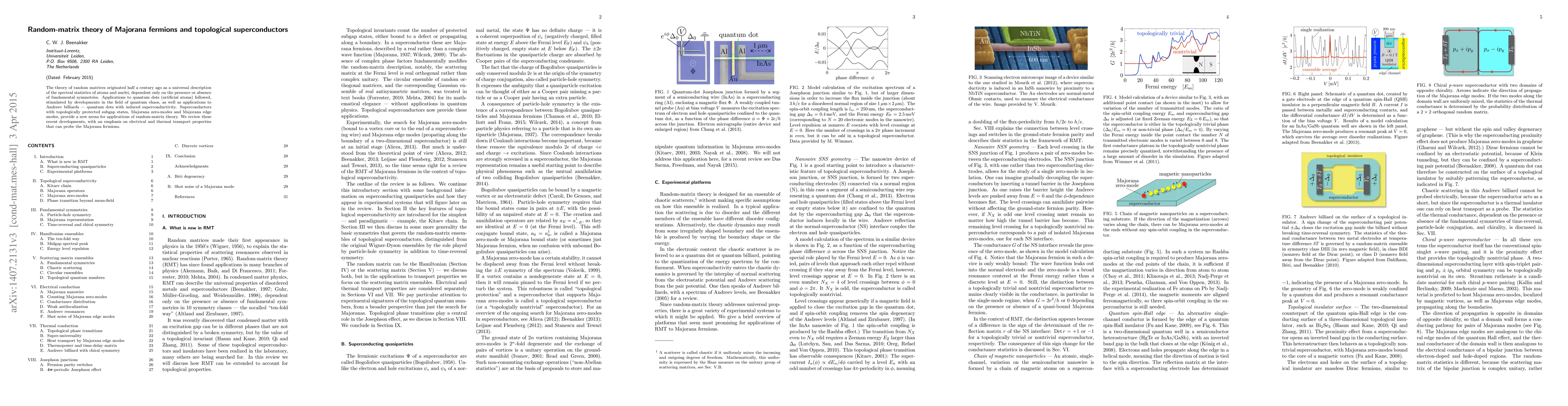 I. Introduction (What is new in RMT, Superconducting quasiparticles, Experimental platforms) II. Topological superconductivity (Kitaev chain, Majorana operators, Majorana zero-modes, Phase transition beyond mean-field) III. Fundamental symmetries (Particle-hole symmetry, Majorana representation, Time-reversal and chiral symmetry) IV. Hamiltonian ensembles (The ten-fold way, Midgap spectral peak, Energy level repulsion) V. Scattering matrix ensembles (Fundamental symmetries, Chaotic scattering, Circular ensembles, Topological quantum numbers) VI. Electrical conduction (Majorana nanowire, Counting Majorana zero-modes, Conductance distribution, Weak antilocalization, Andreev resonances, Shot noise of Majorana edge modes) VII. Thermal conduction (Topological phase transitions, Super-universality, Heat transport by Majorana edge modes, Thermopower and time-delay matrix, Andreev billiard with chiral symmetry) VIII. Josephson junctions (Fermion parity switches, 4{\pi}-periodic Josephson effect, Discrete vortices) IX. Conclusion