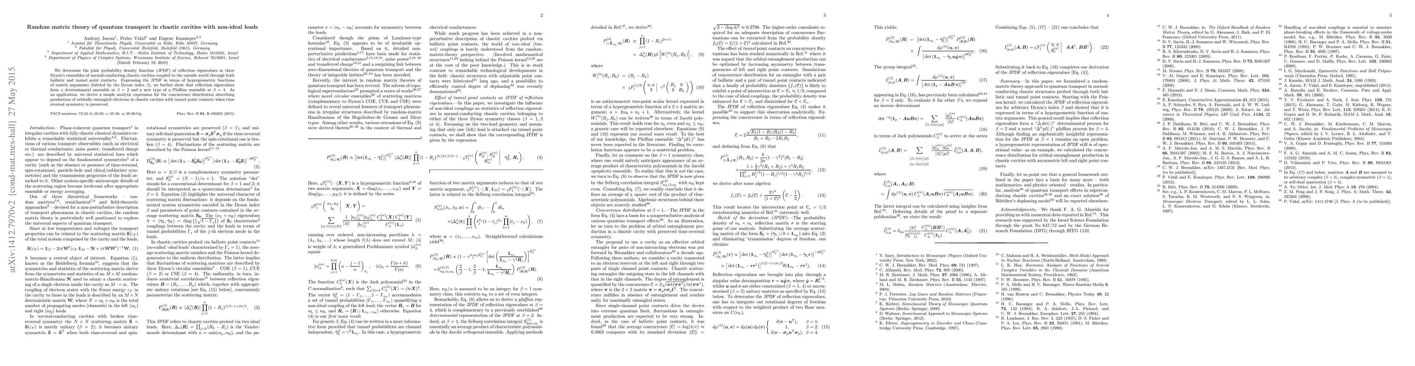 This paper determines the joint probability density function of reflection eigenvalues in chaotic cavities connected via non-ideal leads, revealing determinantal and Pfaffian ensembles for specific Dyson indices. It also provides an analytic expression for the concurrence distribution in such systems.