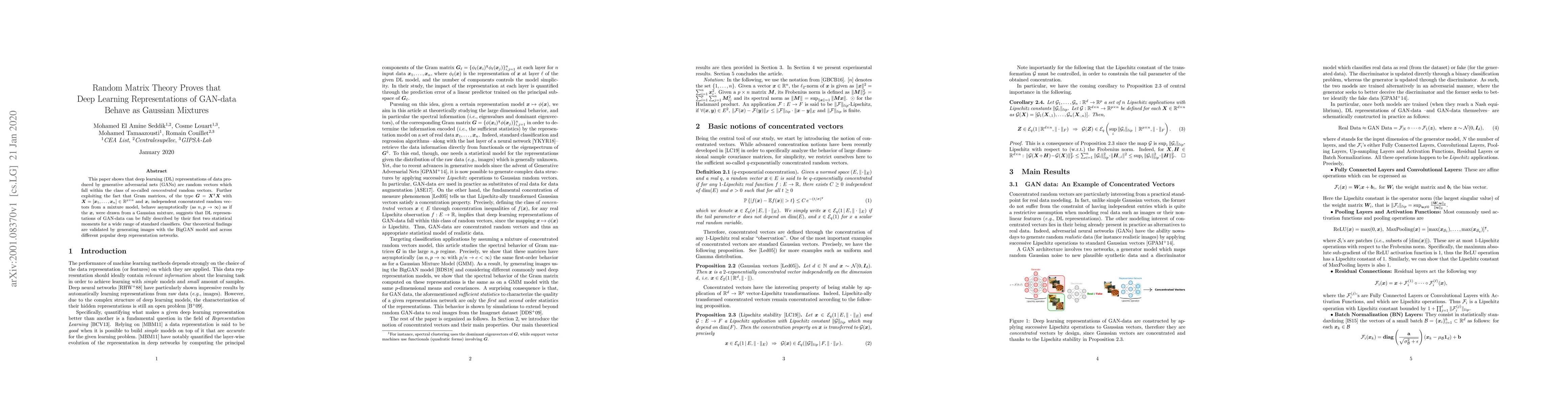 This paper shows that deep learning (DL) representations of data produced by generative adversarial nets (GANs) are random vectors which fall within the class of so-called \textit{concentrated} random vectors. Further exploiting the fact that Gram matrices, of the type $G = X^T X$ with $X=[x_1,\ldots,x_n]\in \mathbb{R}^{p\times n}$ and $x_i$ independent concentrated random vectors from a mixture model, behave asymptotically (as $n,p\to \infty$) as if the $x_i$ were drawn from a Gaussian mixture, suggests that DL representations of GAN-data can be fully described by their first two statistical moments for a wide range of standard classifiers. Our theoretical findings are validated by generating images with the BigGAN model and across different popular deep representation networks.