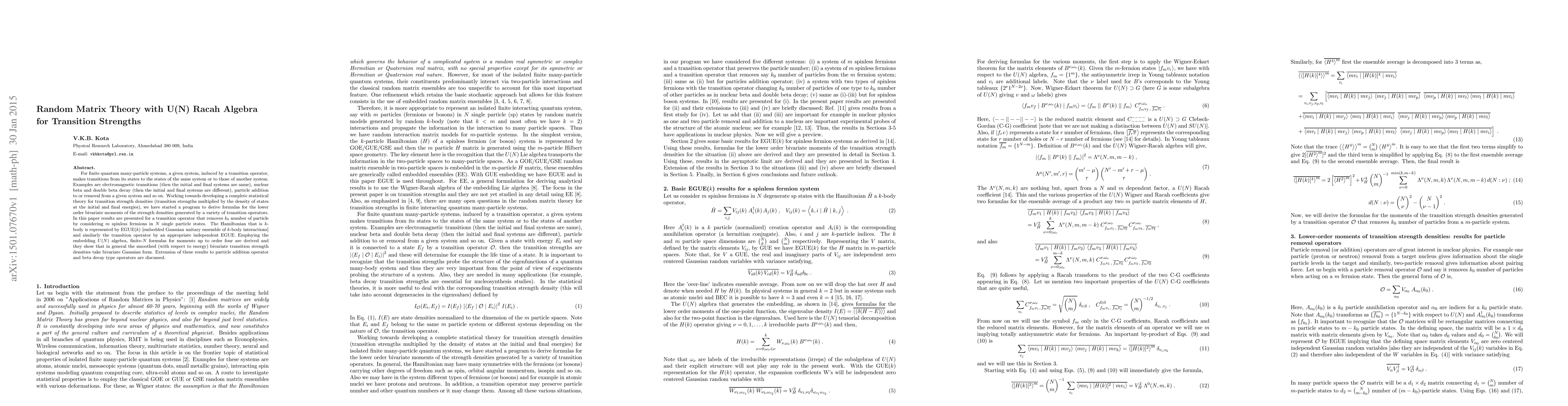 For finite quantum many-particle systems, a given system, induced by a transition operator, makes transitions from its states to the states of the same system or to those of another system. Examples are electromagnetic transitions (then the initial and final systems are same), nuclear beta and double beta decay (then the initial and final systems are different), particle addition to or removal from a given system and so on. Working towards developing a complete statistical theory for transition strength densities (transition strengths multiplied by the density of states at the initial and final energies), we have started a program to derive formulas for the lower order bivariate moments of the strength densities generated by a variety of transition operators. In this paper results are presented for a transition operator that removes $k_0$ number of particle by considering $m$ spinless fermions in $N$ single particle states. The Hamiltonian that is $k$-body is represented by EGUE($k$) [embedded Gaussian unitary ensemble of $k$-body interactions] and similarly the transition operator by an appropriate independent EGUE. Employing the embedding $U(N)$ algebra, finite-$N$ formulas for moments up to order four are derived and they show that in general the smoothed (with respect to energy) bivariate transition strength densities take bivariate Gaussian form. Extension of these results to particle addition operator and beta decay type operators are discussed.