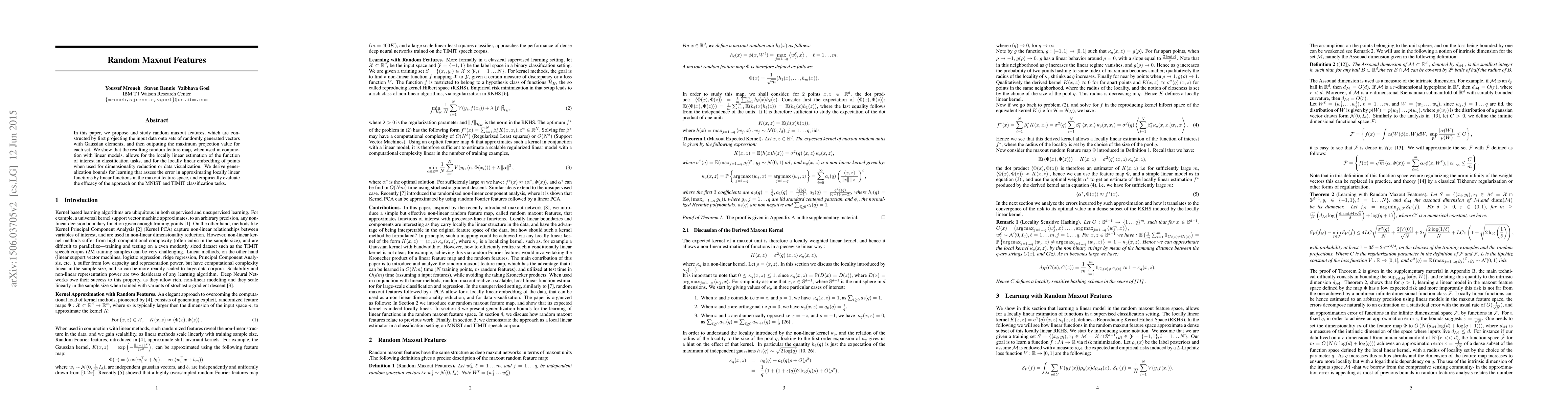 In this paper, we propose and study random maxout features, which are constructed by first projecting the input data onto sets of randomly generated vectors with Gaussian elements, and then outputing the maximum projection value for each set. We show that the resulting random feature map, when used in conjunction with linear models, allows for the locally linear estimation of the function of interest in classification tasks, and for the locally linear embedding of points when used for dimensionality reduction or data visualization. We derive generalization bounds for learning that assess the error in approximating locally linear functions by linear functions in the maxout feature space, and empirically evaluate the efficacy of the approach on the MNIST and TIMIT classification tasks.