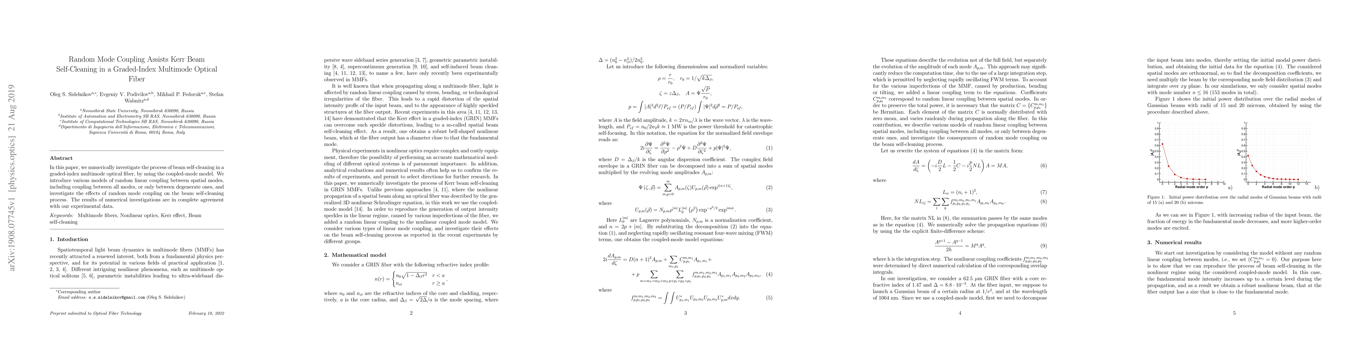 This paper numerically examines how random mode coupling affects Kerr beam self-cleaning in graded-index multimode optical fibers using a coupled-mode model, showing agreement between theoretical and experimental results. Various coupling scenarios are tested, including coupling among all modes and only between degenerate modes.