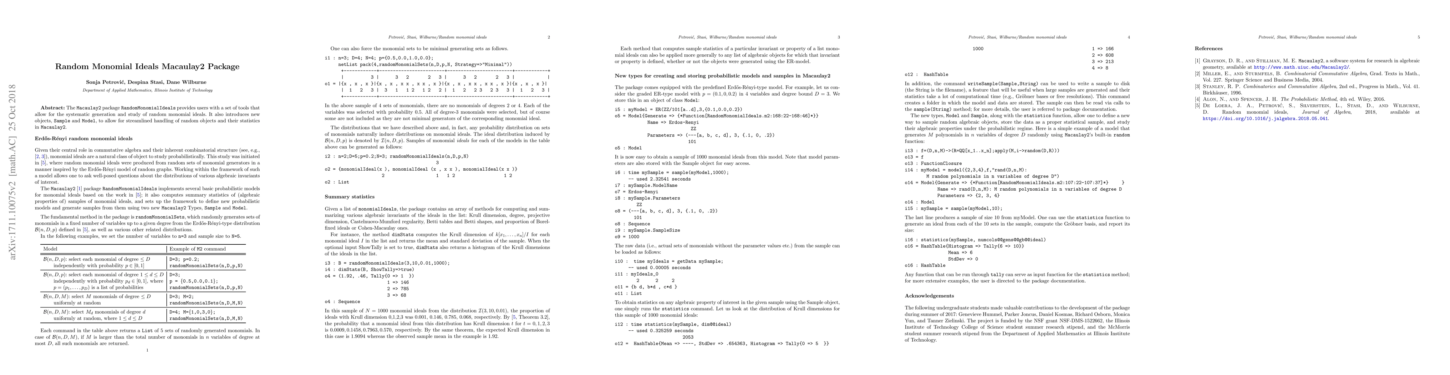 The {\tt RandomMonomialIdeals} package in Macaulay2 generates and studies random monomial ideals, introducing Sample and Model objects for managing random data and statistics. This facilitates systematic exploration in computational commutative algebra.