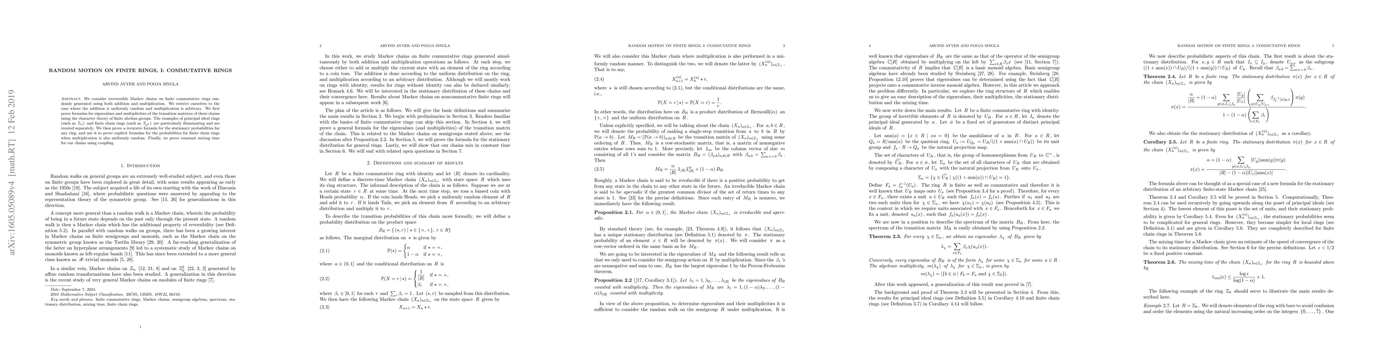 Researchers studied random motion on finite commutative rings using Markov chains, developing formulas for eigenvalues and stationary probabilities, and proving constant mixing times.