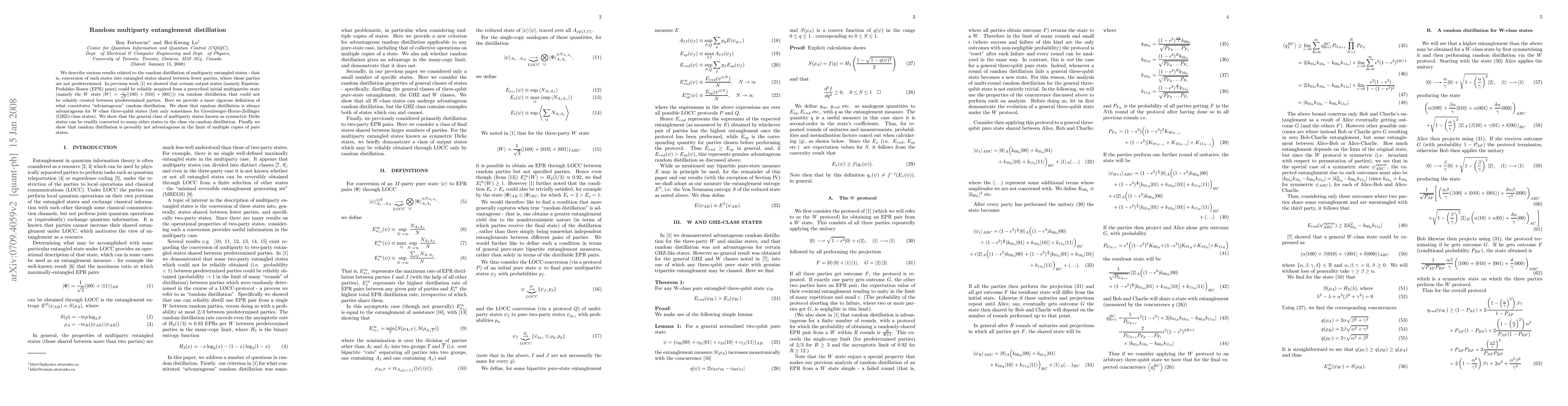 This paper explores the random distillation of multiparty entangled states, demonstrating that it is advantageous for W-class three-qubit states but not always for GHZ-class states. It also shows that symmetric Dicke states can be converted to other states via random distillation, but it is not advantageous when multiple copies of pure states are considered.