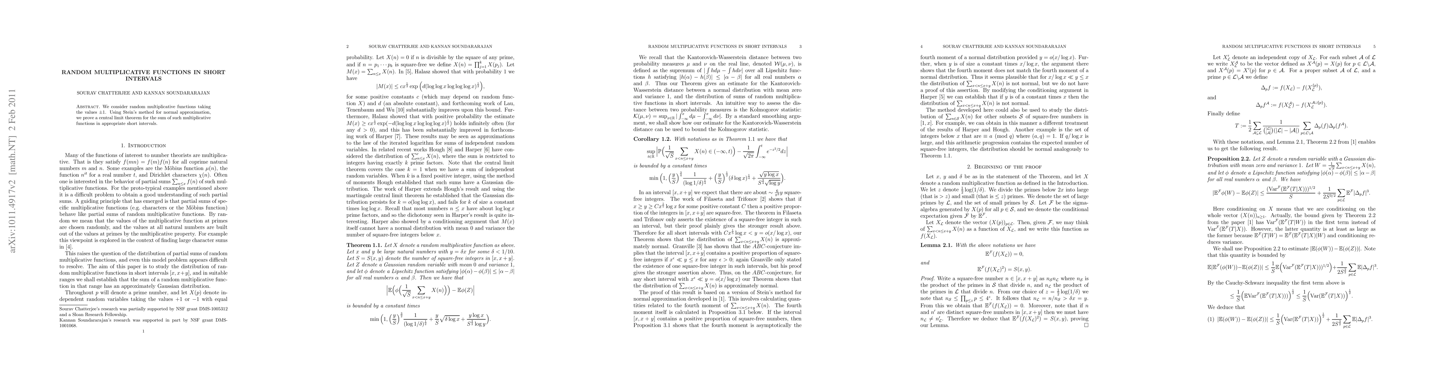 Summary: This paper utilizes Stein's method for normal approximation to establish a central limit theorem for sums of random multiplicative functions that take values of $\pm 1$ in short intervals. The focus is on understanding the behavior of these functions within small intervals.