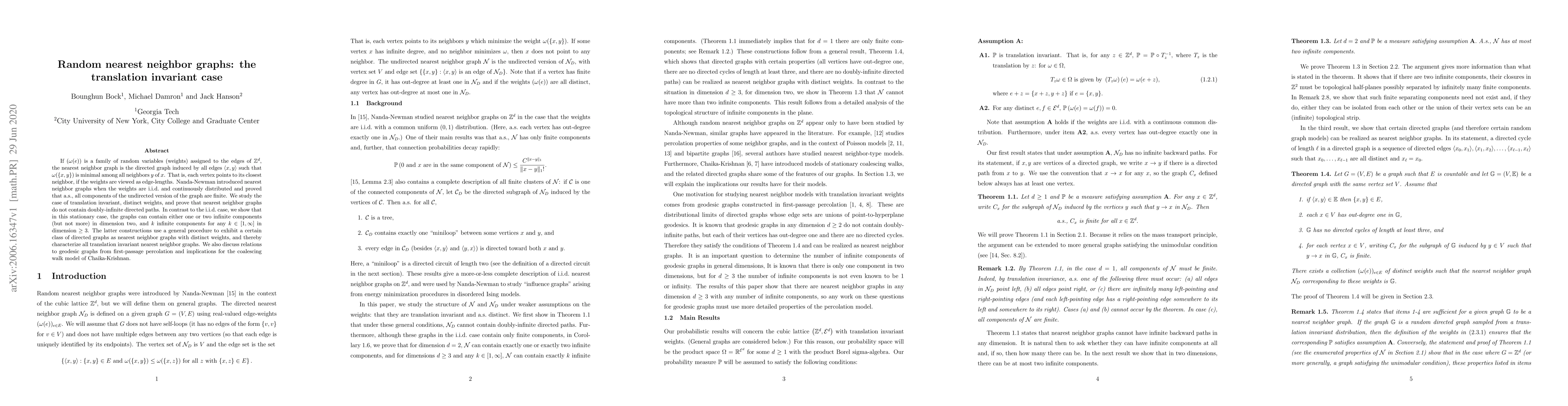 This paper studies translation invariant random nearest neighbor graphs with distinct edge weights, proving that such graphs do not contain doubly-infinite directed paths. It characterizes the number of infinite components in these graphs, showing one or two in dimension two and $k$ for any $k$ in dimension three or higher.