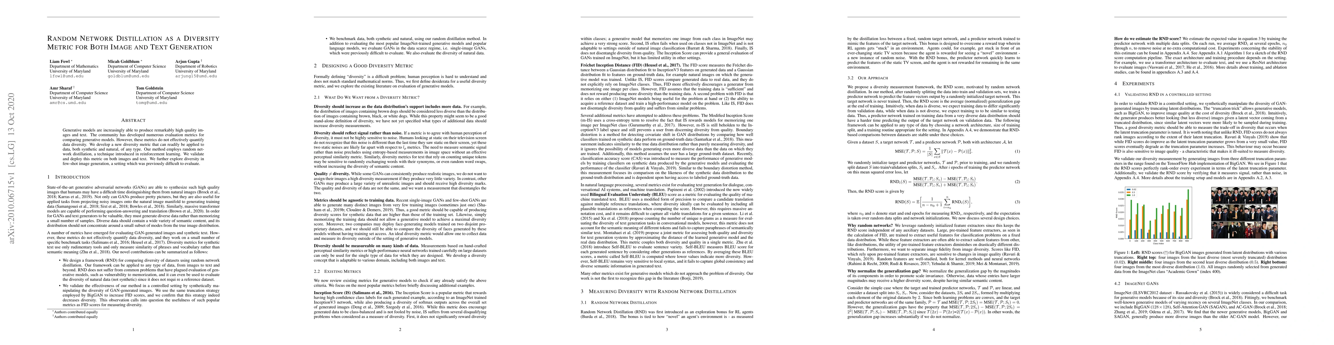 A new diversity metric is introduced for generative models using random network distillation, effectively evaluating data diversity in images and text, including few-shot image generation scenarios.