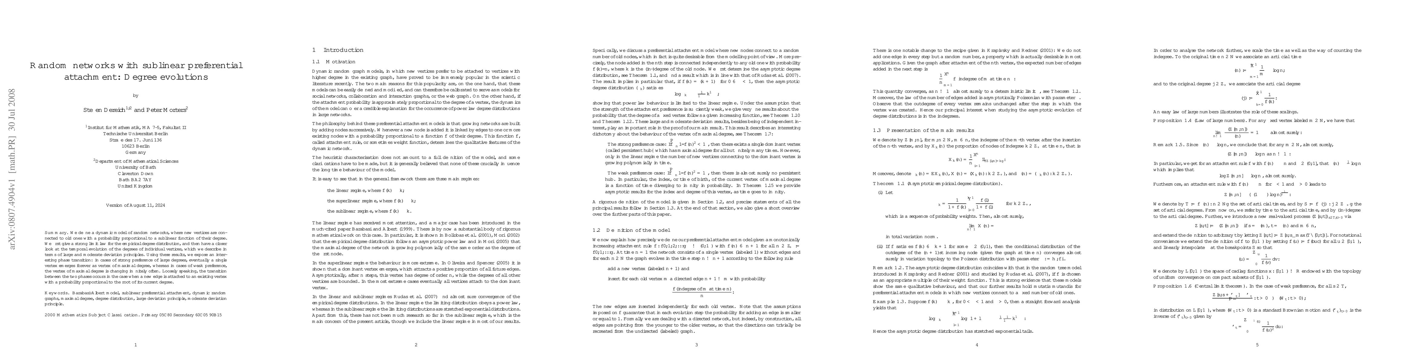 We define a dynamic model of random networks, where new vertices are connected to old ones with a probability proportional to a sublinear function of their degree. We first give a strong limit law for the empirical degree distribution, and then have a closer look at the temporal evolution of the degrees of individual vertices, which we describe in terms of large and moderate deviation principles. Using these results, we expose an interesting phase transition: in cases of strong preference of large degrees, eventually a single vertex emerges forever as vertex of maximal degree, whereas in cases of weak preference, the vertex of maximal degree is changing infinitely often. Loosely speaking, the transition between the two phases occurs in the case when a new edge is attached to an existing vertex with a probability proportional to the root of its current degree.