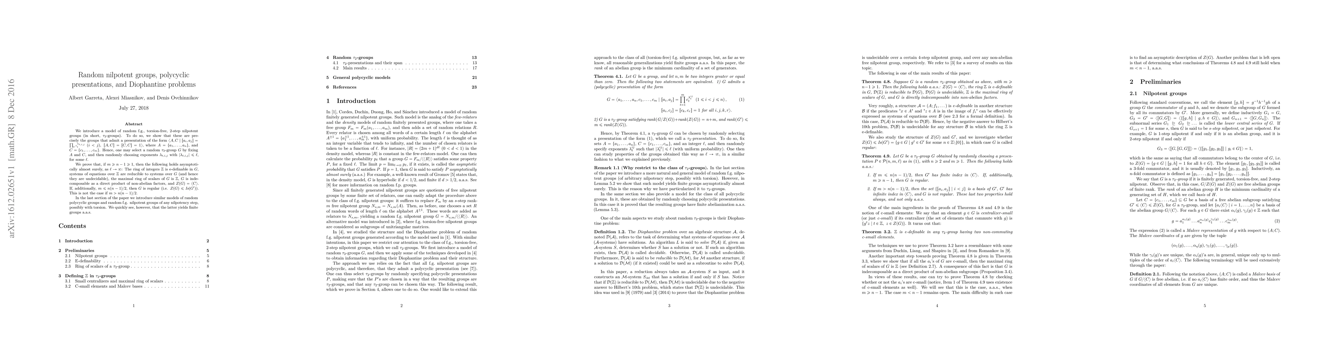 This paper models random finitely generated, torsion-free, 2-step nilpotent groups (τ₂-groups) using specific presentations and proves that under certain conditions on the group's generators, these groups are indecomposable, undecidable, and can e-define the integers. It also extends the model to random polycyclic and general nilpotent groups, noting that higher nilpotency steps often result in finite groups.