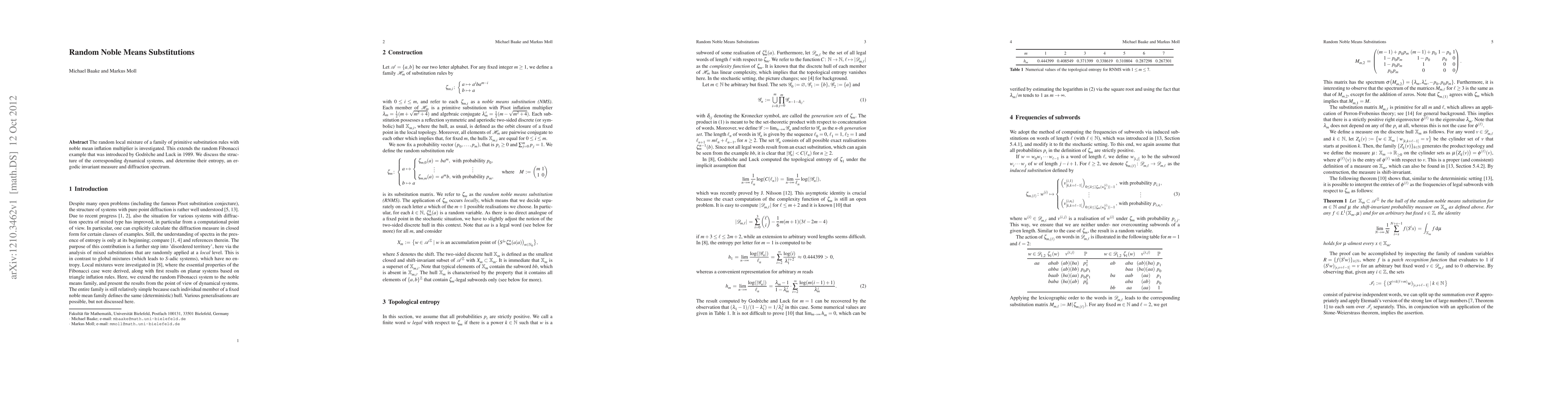 The random local mixture of a family of primitive substitution rules with noble mean inflation multiplier is investigated. This extends the random Fibonacci example that was introduced by Godr\`{e}che and Luck in 1989. We discuss the structure of the corresponding dynamical systems, and determine their entropy, an ergodic invariant measure and diffraction spectrum.