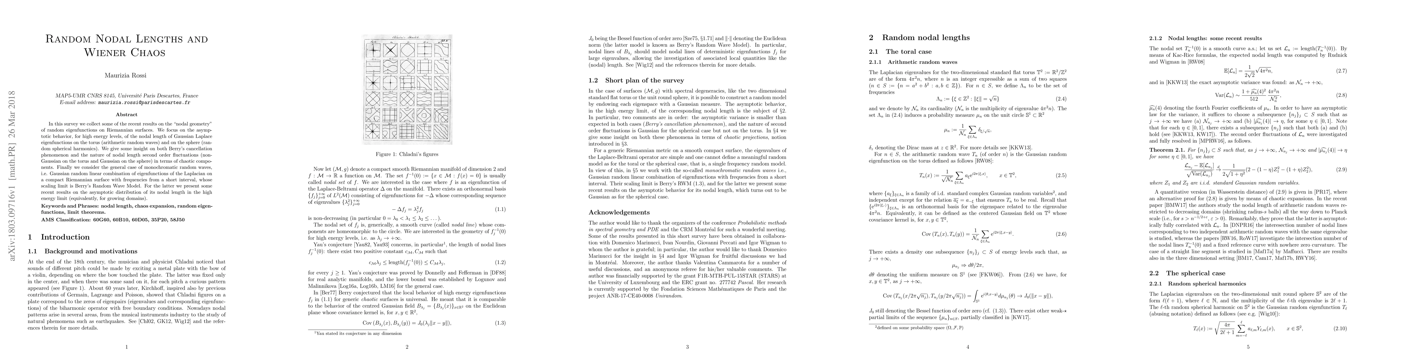 This paper surveys recent research on the nodal geometry of random eigenfunctions on Riemannian surfaces, focusing on asymptotic behavior of nodal length for high energy levels, Berry's cancellation phenomenon, and chaotic components.