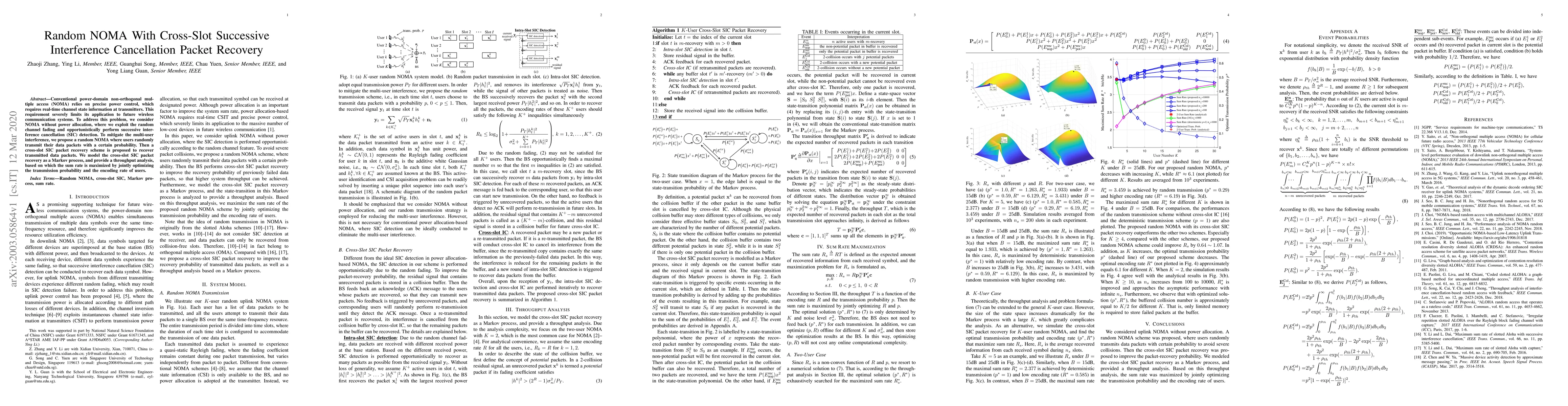 This paper proposes a random NOMA scheme that eliminates the need for precise power control by leveraging random channel fading and opportunistic successive interference cancellation (SIC). A cross-slot SIC packet recovery method is introduced to mitigate multi-user interference, modeled as a Markov process, and analyzed to maximize the sum rate through optimization of transmission probability and encoding rate.