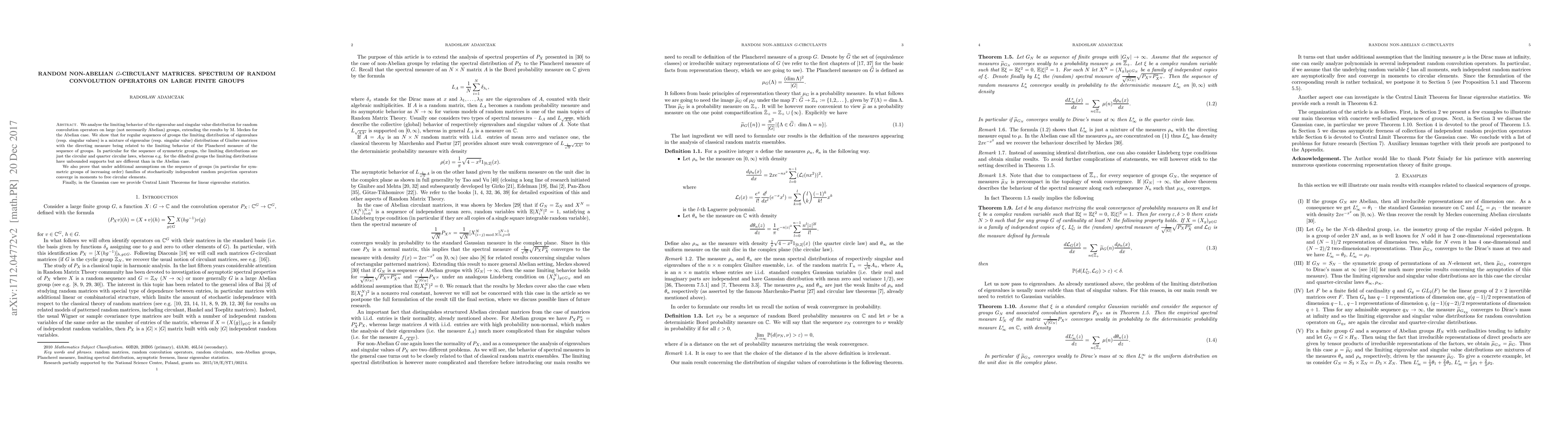 This research paper studies the spectrum of random convolution operators on large finite groups, revealing a mixture of Ginibre matrix distributions with varying supports depending on the group sequence.