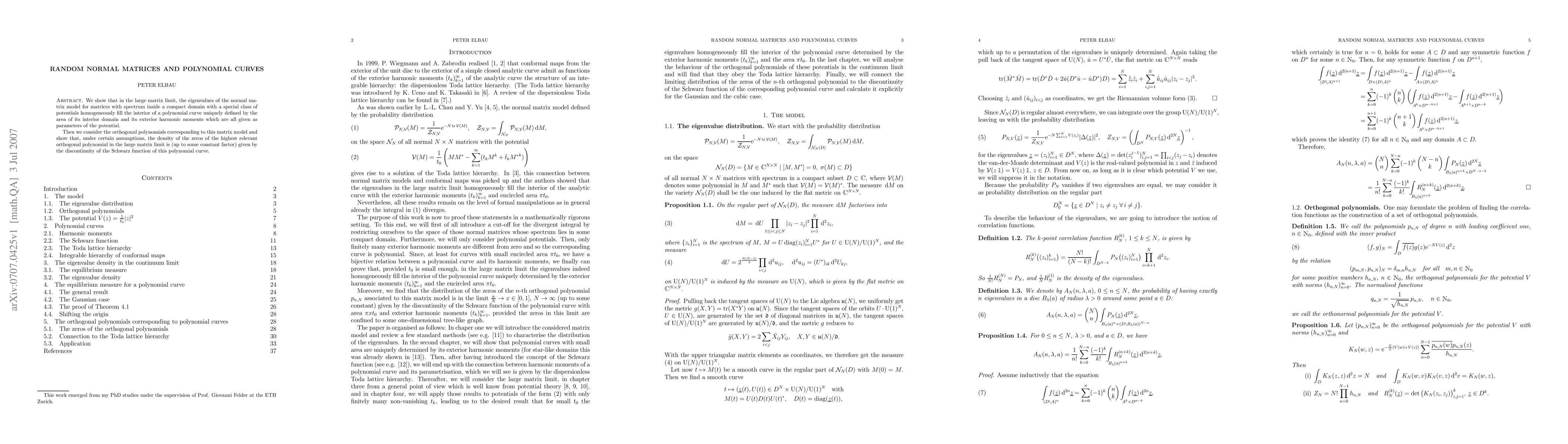 We show that in the large matrix limit, the eigenvalues of the normal matrix model for matrices with spectrum inside a compact domain with a special class of potentials homogeneously fill the interior of a polynomial curve uniquely defined by the area of its interior domain and its exterior harmonic moments which are all given as parameters of the potential. Then we consider the orthogonal polynomials corresponding to this matrix model and show that, under certain assumptions, the density of the zeros of the highest relevant orthogonal polynomial in the large matrix limit is (up to some constant factor) given by the discontinuity of the Schwarz function of this polynomial curve.