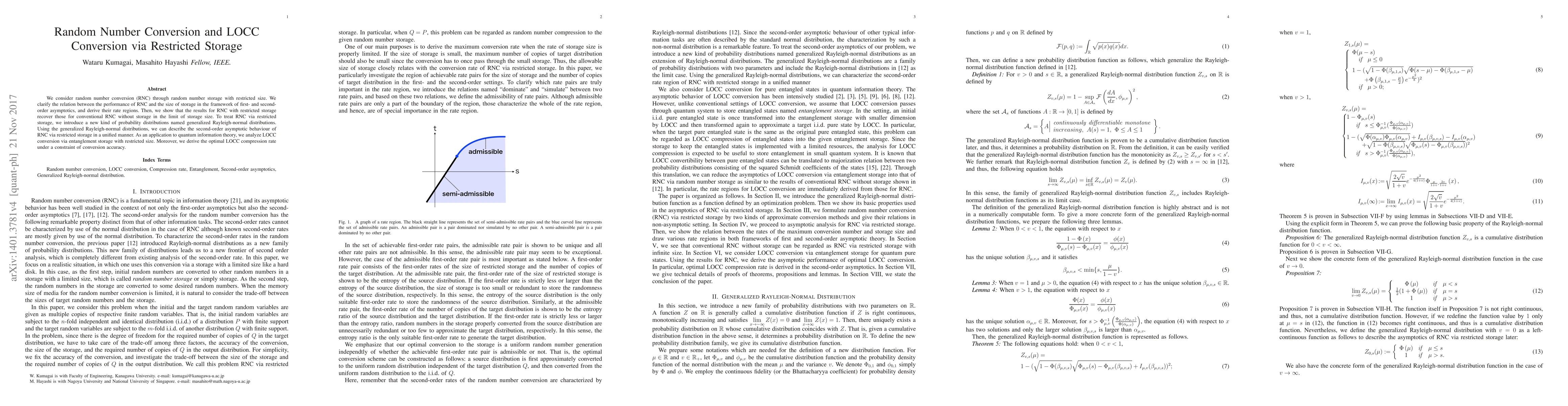 We consider random number conversion (RNC) through random number storage with restricted size. We clarify the relation between the performance of RNC and the size of storage in the framework of first- and second- order asymptotics, and derive their rate regions. Then, we show that the results for RNC with restricted storage recover those for conventional RNC without storage in the limit of storage size. To treat RNC via restricted storage, we introduce a new kind of probability distributions named generalized Rayleigh-normal distributions. Using the generalized Rayleigh-normal distributions, we can describe the second-order asymptotic behaviour of RNC via restricted storage in a unified manner. As an application to quantum information theory, we analyze LOCC conversion via entanglement storage with restricted size. Moreover, we derive the optimal LOCC compression rate under a constraint of conversion accuracy.