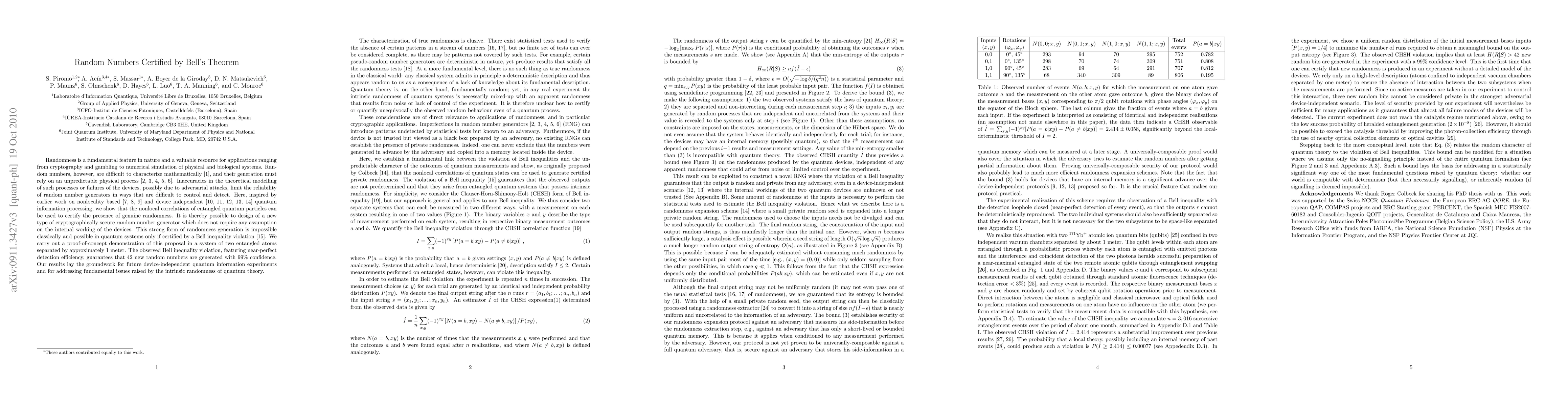 This paper proposes a novel quantum-based method to certify genuine randomness using entangled particles and Bell's theorem, demonstrating a proof-of-concept with entangled atoms. The method ensures cryptographically secure random number generation without relying on device assumptions, offering a new approach to randomness in quantum systems.