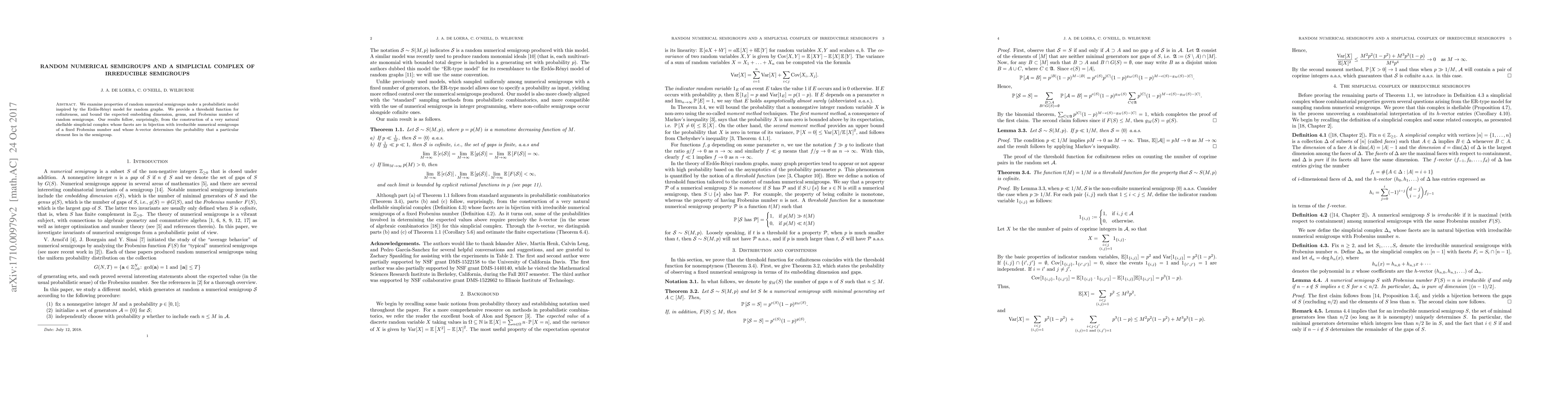 This paper explores the probabilistic properties of random numerical semigroups using an Erdos-Renyi inspired model. It introduces a threshold function for cofiniteness and bounds the expected embedding dimension, genus, and Frobenius number, relying on the construction of a shellable simplicial complex linked to irreducible numerical semigroups.