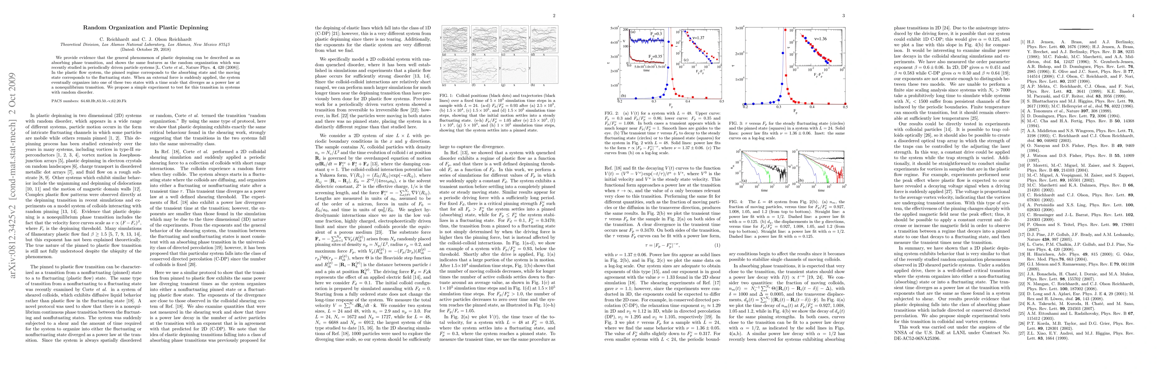 This paper explores the phenomenon of plastic depinning, linking it to random organization observed in periodically driven particle systems. It suggests that applying an external force causes the system to transition between a pinned (quiescent) and a moving (fluctuating) state, with the transition time scaling as a power law near a nonequilibrium critical point. The authors propose a simple experimental test for this transition in colloidal and superconducting vortex systems.