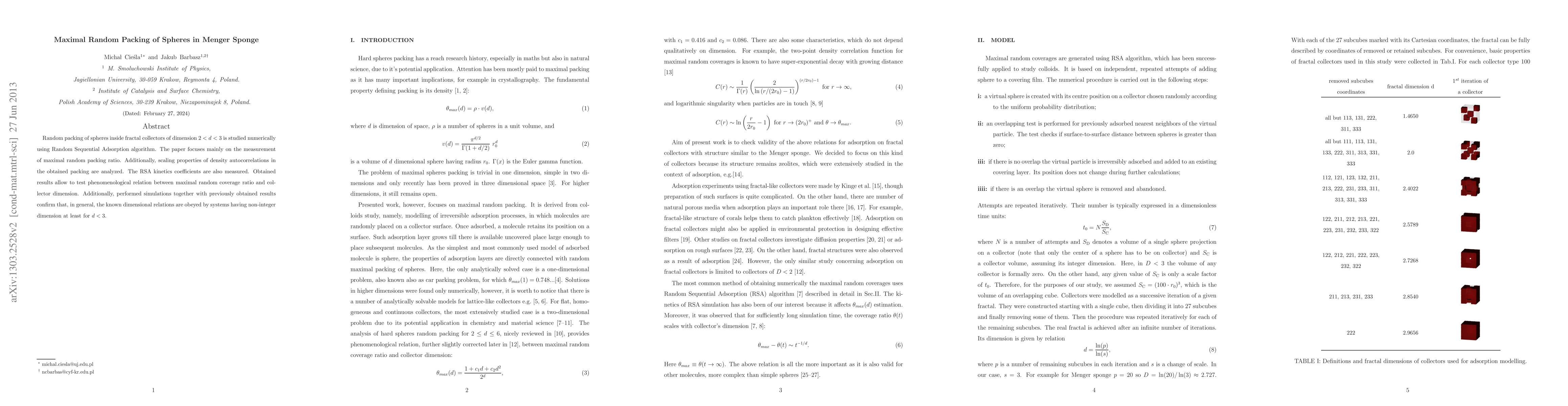 Random packing of spheres inside fractal collectors of dimension 2 < d < 3 is studied numerically using Random Sequential Adsorption (RSA) algorithm. The paper focuses mainly on the measurement of random packing saturation limit. Additionally, scaling properties of density autocorrelations in the obtained packing are analyzed. The RSA kinetics coefficients are also measured. Obtained results allow to test phenomenological relation between random packing saturation density and collector dimension. Additionally, performed simulations together with previously obtained results confirm that, in general, the known dimensional relations are obeyed by systems having non-integer dimension, at least for d < 3.