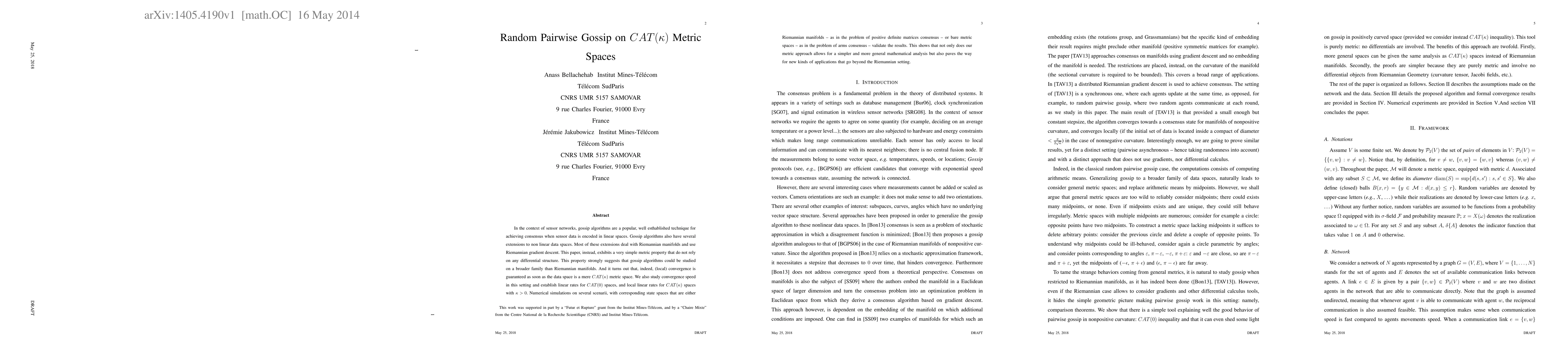 In the context of sensor networks, gossip algorithms are a popular, well esthablished technique for achieving consensus when sensor data is encoded in linear spaces. Gossip algorithms also have several extensions to non linear data spaces. Most of these extensions deal with Riemannian manifolds and use Riemannian gradient descent. This paper, instead, exhibits a very simple metric property that do not rely on any differential structure. This property strongly suggests that gossip algorithms could be studied on a broader family than Riemannian manifolds. And it turns out that, indeed, (local) convergence is guaranteed as soon as the data space is a mere $CAT(\kappa)$ metric space. We also study convergence speed in this setting and establish linear rates for $CAT(0)$ spaces, and local linear rates for $CAT(\kappa)$ spaces with $\kappa > 0$. Numerical simulations on several scenarii, with corresponding state spaces that are either Riemannian manifolds -- as in the problem of positive definite matrices consensus -- or bare metric spaces -- as in the problem of arms consensus -- validate the results. This shows that not only does our metric approach allows for a simpler and more general mathematical analysis but also paves the way for new kinds of applications that go beyond the Riemannian setting.