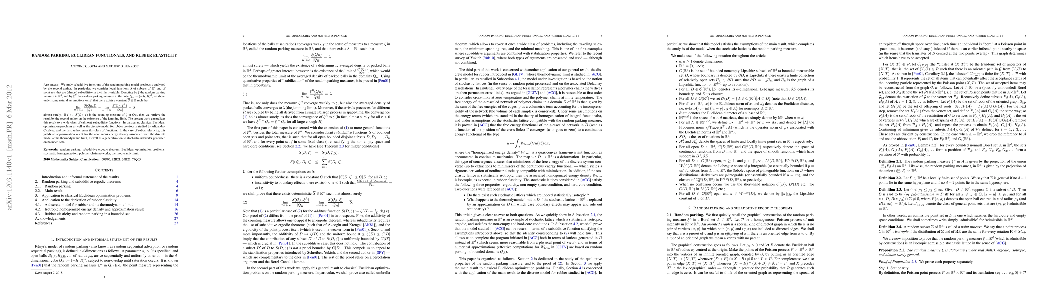 We study subadditive functions of the random parking model previously analyzed by the second author. In particular, we consider local functions $S$ of subsets of $\mathbb{R}^d$ and of point sets that are (almost) subadditive in their first variable. Denoting by $\xi$ the random parking measure in $\mathbb{R}^d$, and by $\xi^R$ the random parking measure in the cube $Q_R=(-R,R)^d$, we show, under some natural assumptions on $S$, that there exists a constant $\bar{S}\in \mathbb{R}$ such that % $$ \lim_{R\to +\infty} \frac{S(Q_R,\xi)}{|Q_R|}\,=\,\lim_{R\to +\infty}\frac{S(Q_R,\xi^R)}{|Q_R|}\,=\,\bar{S} $$ % almost surely. If $\zeta \mapsto S(Q_R,\zeta)$ is the counting measure of $\zeta$ in $Q_R$, then we retrieve the result by the second author on the existence of the jamming limit. The present work generalizes this result to a wide class of (almost) subadditive functions. In particular, classical Euclidean optimization problems as well as the discrete model for rubber previously studied by Alicandro, Cicalese, and the first author enter this class of functions. In the case of rubber elasticity, this yields an approximation result for the continuous energy density associated with the discrete model at the thermodynamic limit, as well as a generalization to stochastic networks generated on bounded sets.