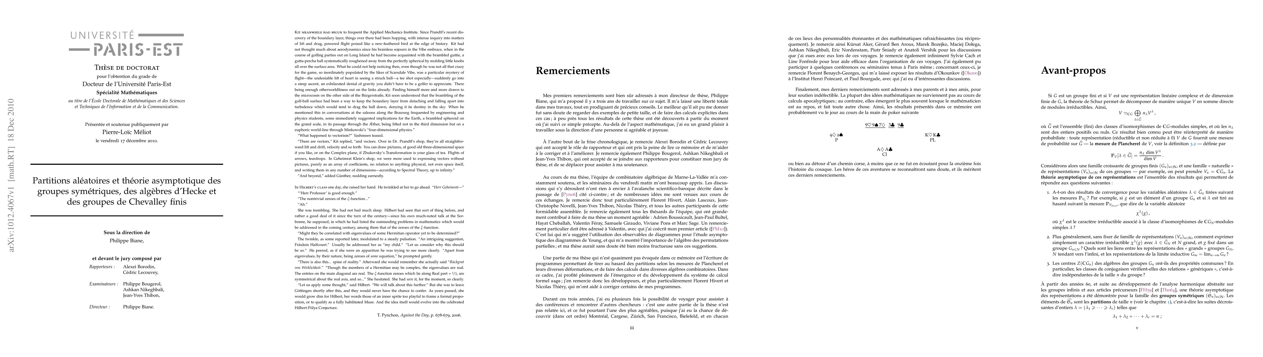 This thesis explores the asymptotic behavior of random partitions derived from representation theory of symmetric groups and finite Chevalley groups, proving laws of large numbers and central limit theorems for various measures. It employs the RSK algorithm to study longest increasing subsequences and develops a moments technique for random partitions, leveraging polynomial functions on Young diagrams.