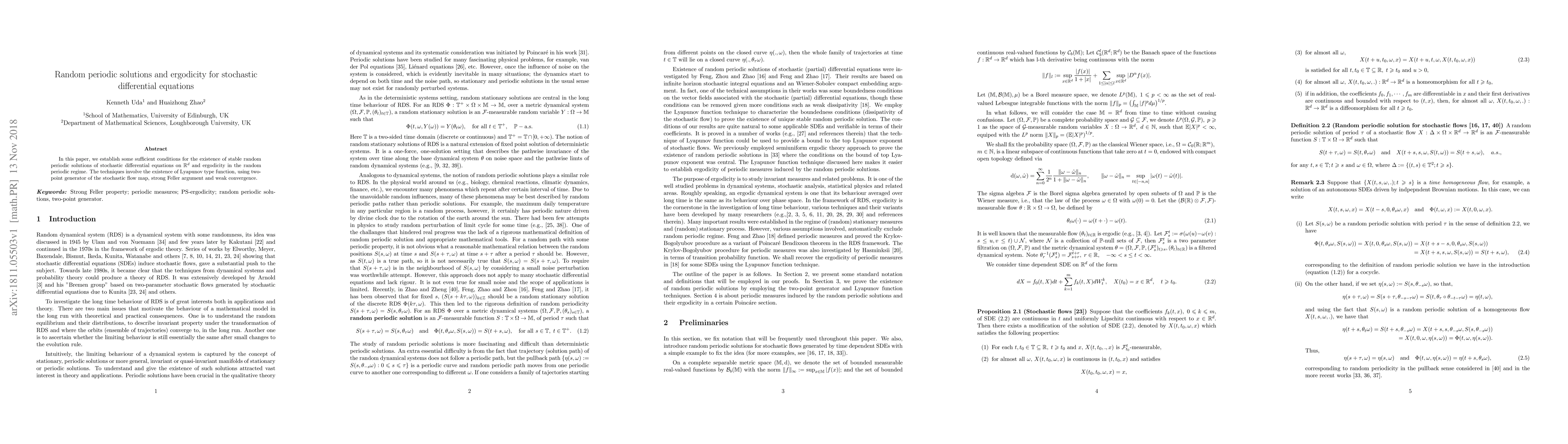 This paper establishes sufficient conditions for stable random periodic solutions and ergodicity in stochastic differential equations, employing Lyapunov functions, stochastic flow maps, the strong Feller property, and weak convergence techniques.