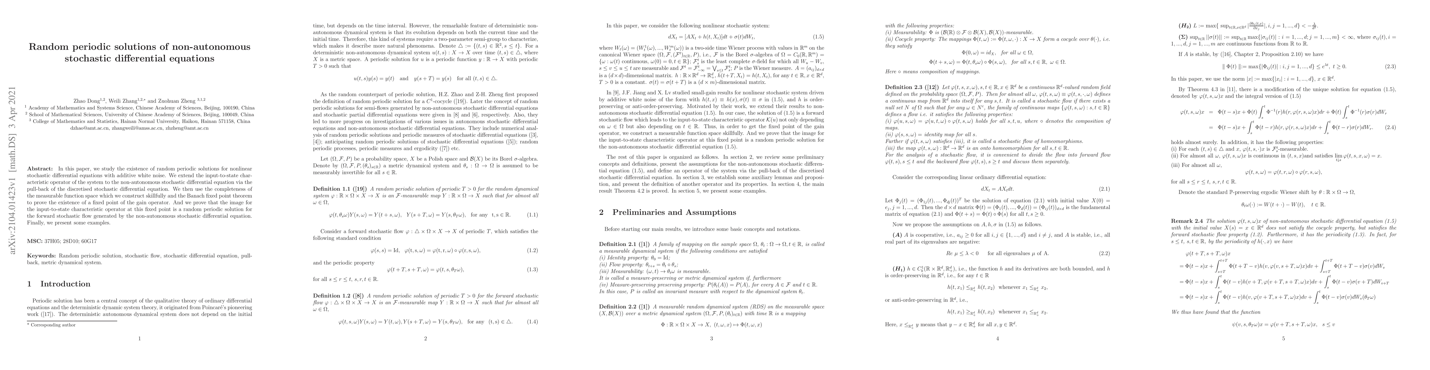 In this paper, we study the existence of random periodic solutions for nonlinear stochastic differential equations with additive white noise. We extend the input-to-state characteristic operator of the system to the non-autonomous stochastic differential equation via the pull-back of the discretised stochastic differential equation. We then use the completeness of the measurable function space which we construct skillfully and the Banach fixed point theorem to prove the existence of a fixed point of the gain operator. And we prove that the image for the input-to-state characteristic operator at this fixed point is a random periodic solution for the forward stochastic flow generated by the non-autonomous stochastic differential equation. Finally, we present some examples.